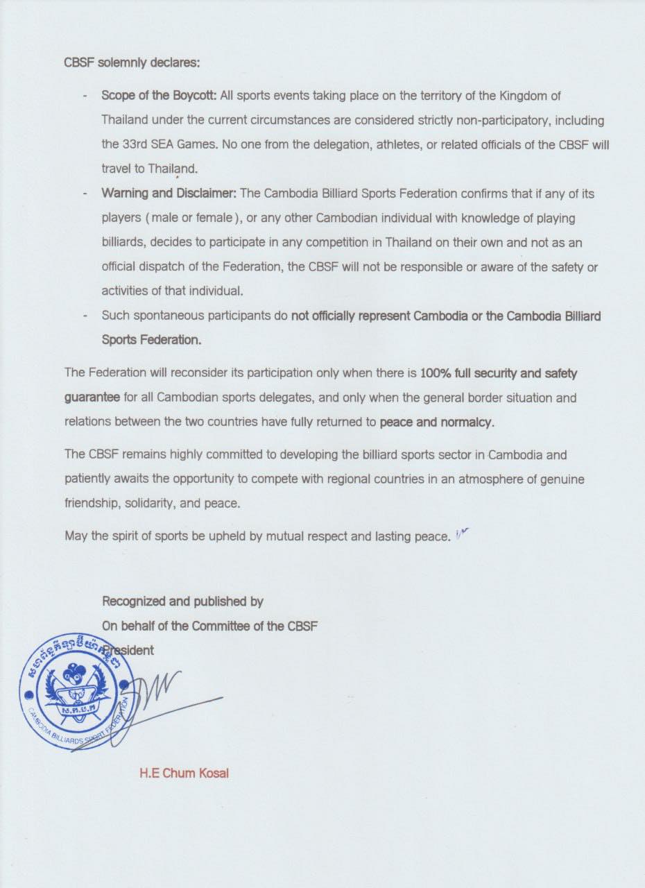 สหพันธ์กีฬาบิลเลียดกัมพูชา (CBSF) ตัดสินใจที่จะไม่ส่งตัวแทนนักกีฬาเข้าร่วมการแข่งขันกีฬาซีเกมส์ ครั้งที่ 33 ที่ประเทศไทยเป็นเจ้าภาพ ในเดือนธันวาคมนี้ ตามรายงานของสื่อ Phnom Penh Post