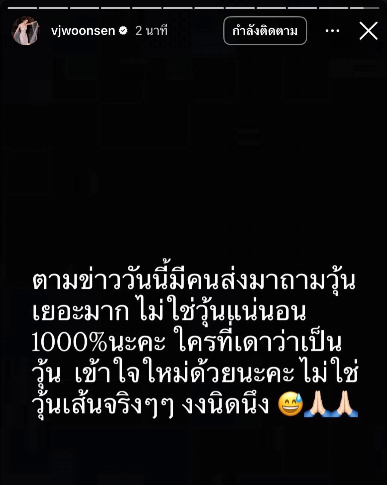 ในอินสตาแกรมสตอรี่ วุ้นเส้นได้ออกมาปฏิเสธอย่างหนักแน่นต่อข่าวฉาวดังกล่าว ระบุว่า “ตามข่าววันนี้มีคนส่งมาถามวุ้นเยอะมาก ไม่ใช่วุ้นแน่นอน 1000% นะคะ ใครที่เดาว่าเป็นวุ้น เข้าใจใหม่ด้วยนะคะ ไม่ใช่วุ้นเลยจริงๆ งงนิดนึง”