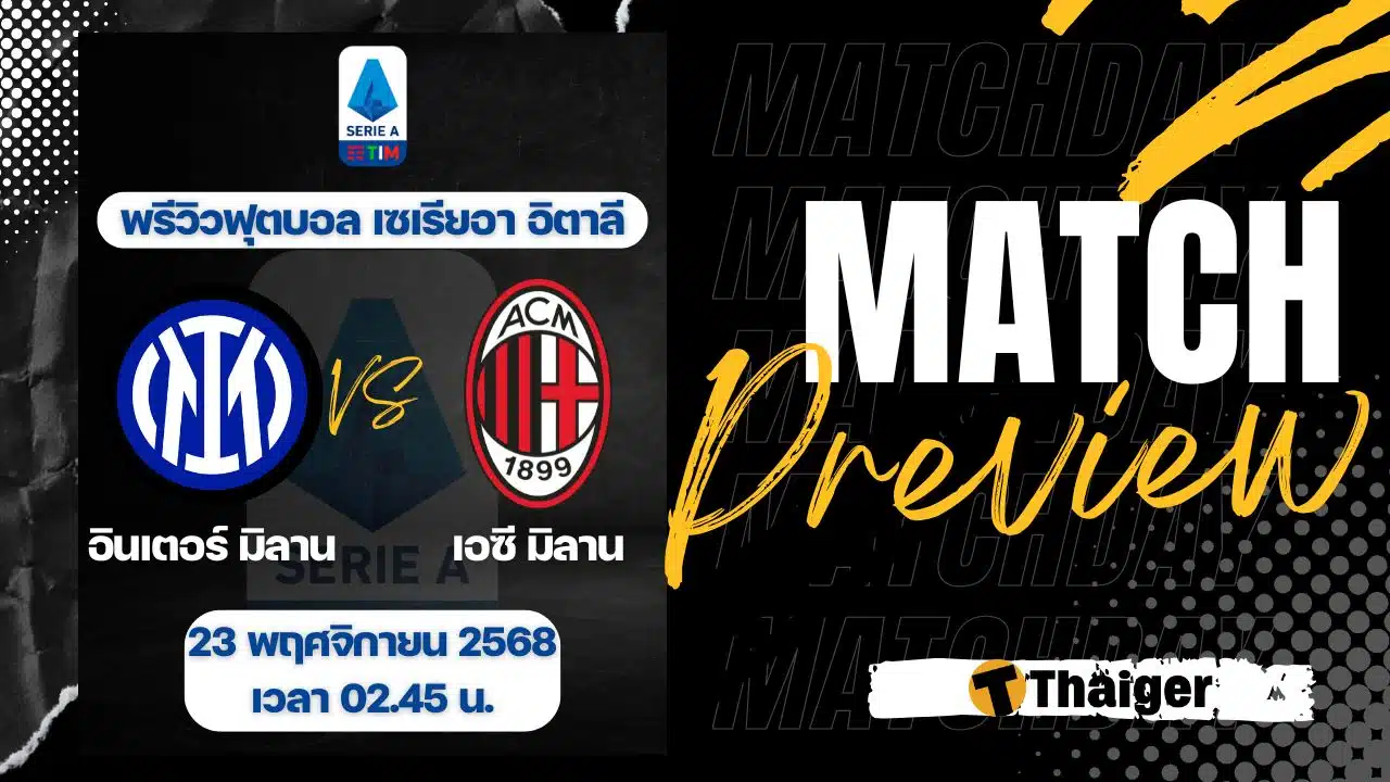 23 พฤศจิกายน 2568 เวลา 02.45 น. ถ่ายทอดสด ดูบอลสด ฟุตบอล กัลโช่ เซเรียอา อิตาลี ฤดูกาล 2025/26 ที่สนาม จูเซ็ปเป้ เมอัซซ่า อินเตอร์ มิลาน พบ เอซี มิลาน The Thaiger พาไปวิเคราะห์เกม พร้อมการทำนายผล และคาดการณ์ 11 ตัวจริงได้ที่นี่