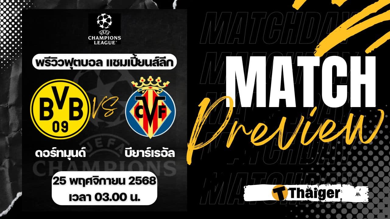 25 พฤศจิกายน 68 ดูบอลสด ฟุตบอล ยูฟ่า แชมเปี้ยนส์ ลีก รอบลีกเฟส นัดที่ 5 ระหว่าง ดอร์ทมุนด์ พบ บียาร์เรอัล ที่สนาม ซิกนัล อิดูน่า พาร์ค เวลา 03:00 น. ตามเวลาประเทศไทย พร้อมถ่ายทอดสด