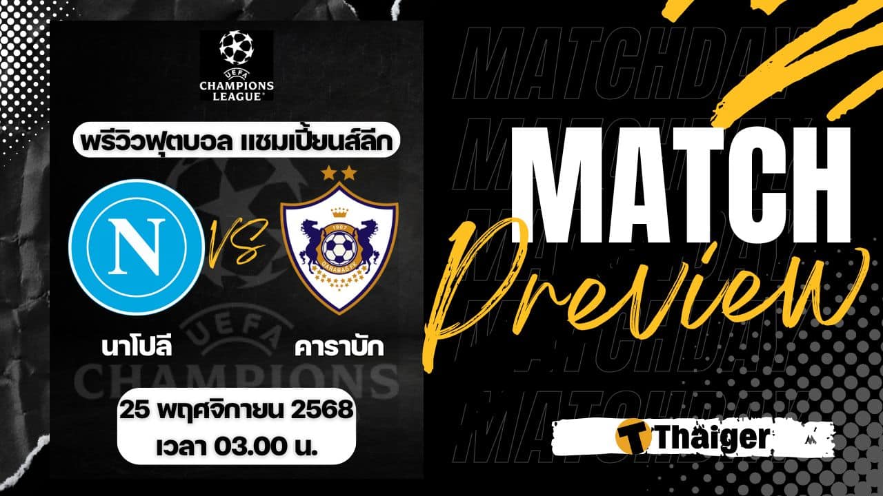 25 พฤศจิกายน 68 ดูบอลสด ฟุตบอล ยูฟ่า แชมเปี้ยนส์ ลีก รอบลีกเฟส นัดที่ 5 ระหว่าง นาโปลี พบ คาราบัก ที่สนาม สตาดิโอ ดิเอโก้ อาร์มันโด้ มาราโดน่า เวลา 03:00 น. ตามเวลาประเทศไทย พร้อมถ่ายทอดสด