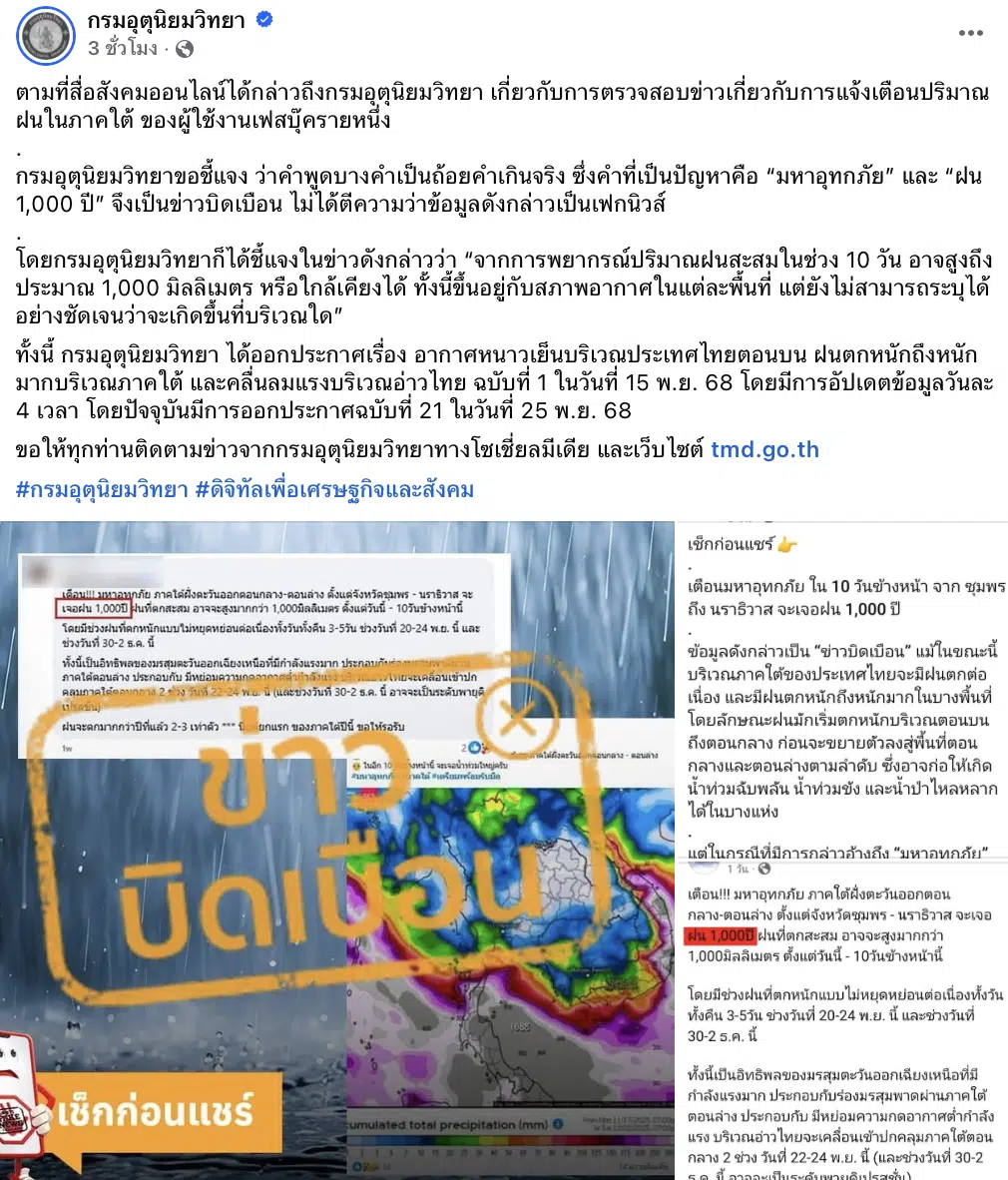 “ตามที่สื่อสังคมออนไลน์ได้กล่าวถึงกรมอุตุนิยมวิทยา เกี่ยวกับการตรวจสอบข่าวเกี่ยวกับการแจ้งเตือนปริมาณฝนในภาคใต้ ของผู้ใช้งานเฟสบุ๊ครายหนึ่ง