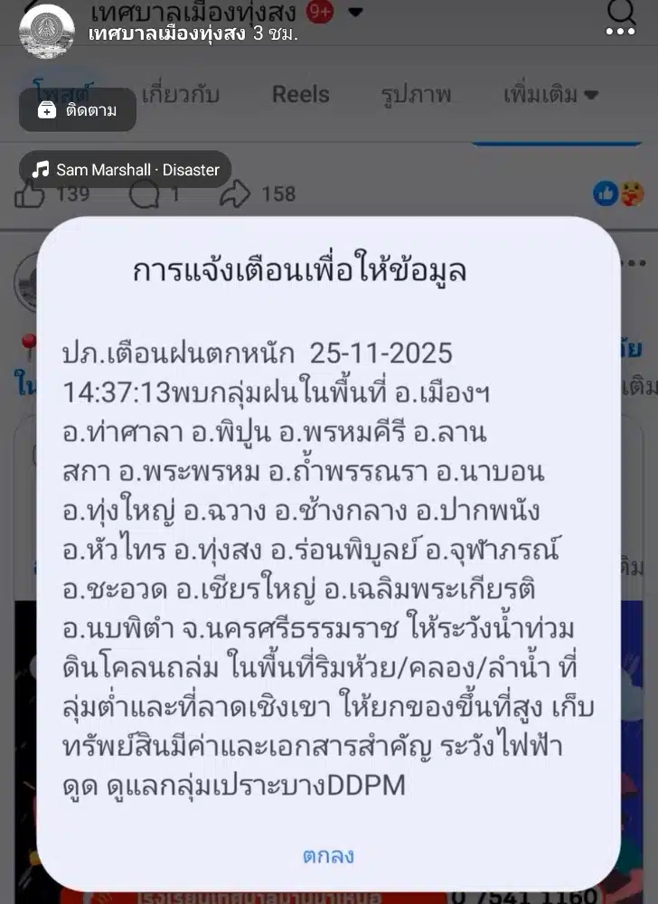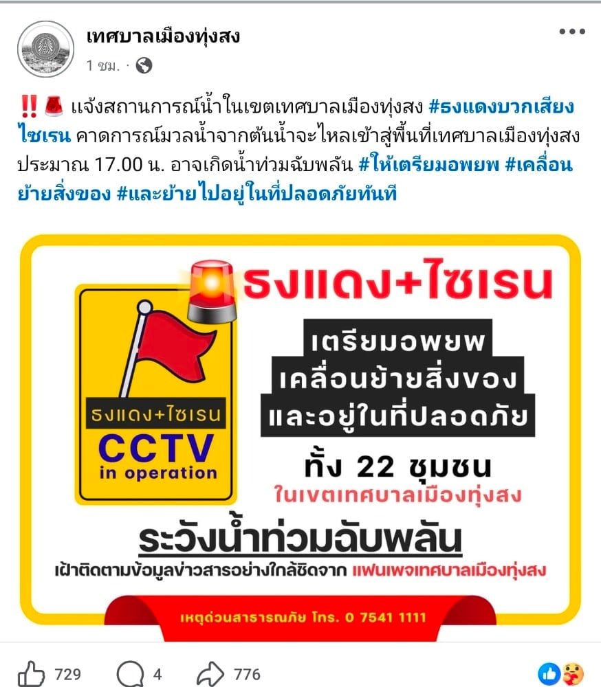 เทศบาลเมืองทุ่งสงออกประกาศแจ้งเตือนด่วนที่สุด ระบุว่ามวลน้ำปริมาณมากจากพื้นที่ต้นน้ำกำลังไหลเข้าสู่เขตเทศบาล คาดการณ์ว่าจะถึงพื้นที่ในช่วงเวลาประมาณ 17.00 น. ของวันนี้ เกิดความเสี่ยงน้ำท่วมฉับพลันรุนแรง จึงขอให้ประชาชนในเขตเทศบาลทั้ง 22 ชุมชนเตรียมความพร้อมในการอพยพ เคลื่อนย้ายทรัพย์สินมีค่า เอกสารสำคัญ ยานพาหนะ ไปยังพื้นที่ปลอดภัย และระมัดระวังอันตรายจากกระแสไฟฟ้าดูด