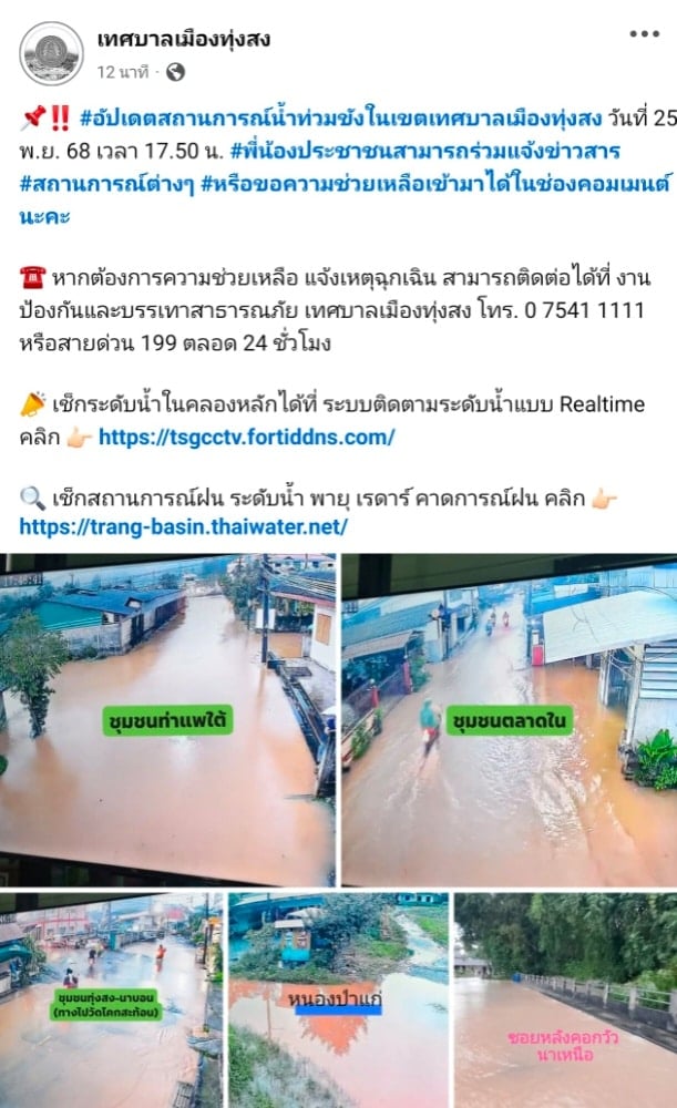 ประชาชนที่ต้องการความช่วยเหลือฉุกเฉิน สามารถติดต่อได้ที่ งานป้องกันและบรรเทาสาธารณภัย เทศบาลเมืองทุ่งสง หมายเลขโทรศัพท์ 0 7541 1111 หรือสายด่วน 199 ตลอด 24 ชั่วโมง นอกจากนี้ยังสามารถตรวจสอบระดับน้ำแบบ Realtime ได้ที่เว็บไซต์ https://www.google.com/search?q=tsgcctv.fortiddns.com และติดตามสถานการณ์ฝนได้ที่ trang-basin.thaiwater.net