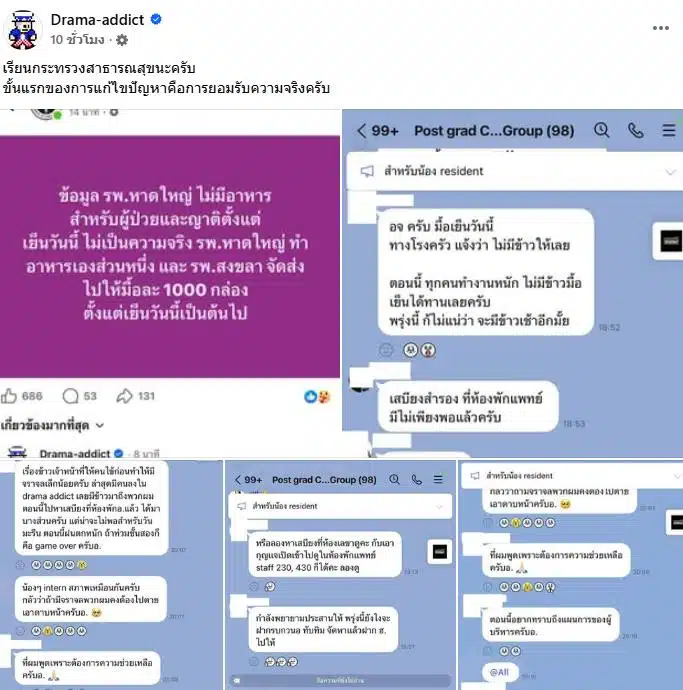 ก่อนจะทางเพจ Drama Addict โพสต์แชตพูดคุยกับบุคลากรทางแพทย์ที่ประสบปัญหา พร้อมเขียนข้อความอีกด้วยว่า “เรียนกระทรวงสาธารณสุขนะครับ ขั้นแรกของการแก้ไขปัญหาคือการยอมรับความจริงครับ”
