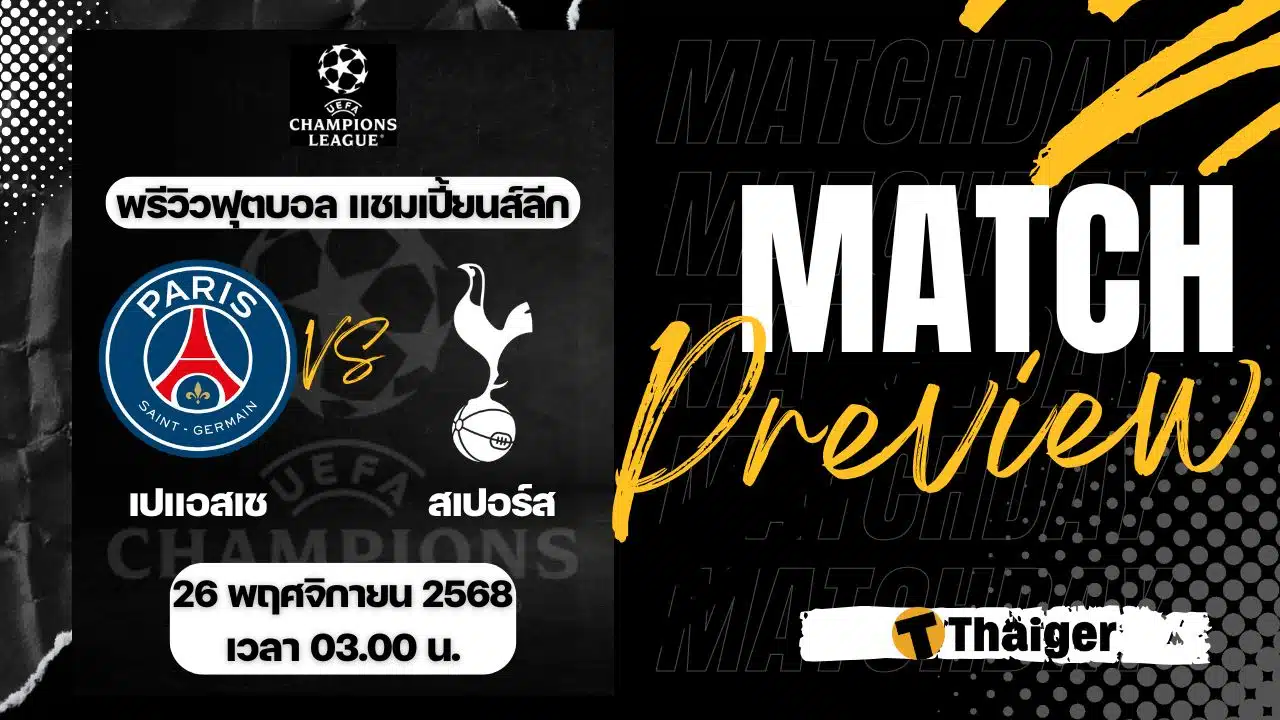 26 พฤศจิกายน 68 ดูบอลสด ฟุตบอล ยูฟ่า แชมเปี้ยนส์ ลีก รอบลีกเฟส นัดที่ 5 ระหว่าง เปแอสเช พบ สเปอร์ส ที่สนาม พาร์ค เดอส์ แพร็งซ์ เวลา 03:00 น. ตามเวลาประเทศไทย พร้อมถ่ายทอดสด