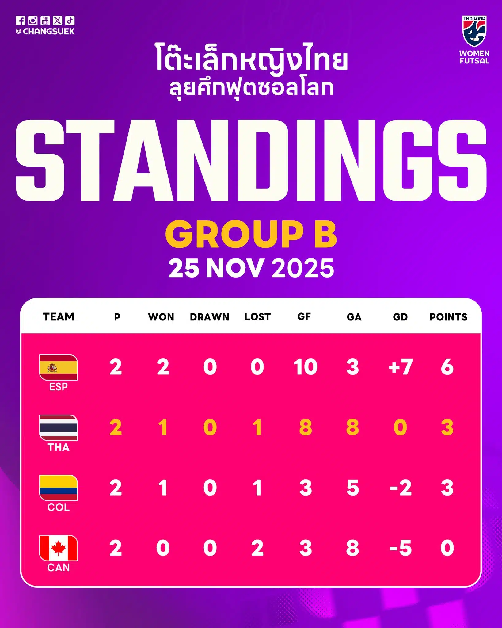 อัปเดตตารางคะแนนล่าสุด ของทัพโต๊ะเล็กชบาแก้ว ในการแข่งขัน ฟุตซอลหญิงชิงแชมป์โลก 2025 รอบแบ่งกลุ่ม ที่ประเทศฟิลิปปินส์