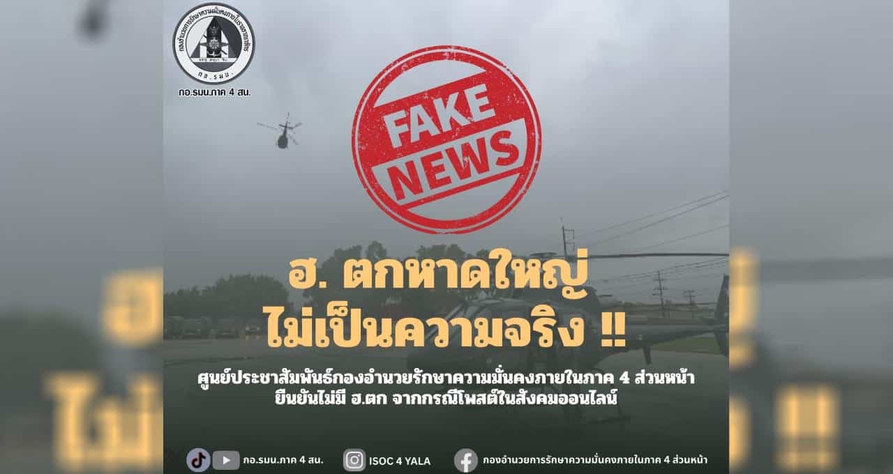 กองอำนวยการรักษาความมั่นคงภายในภาค 4 ส่วนหน้า โพสต์ข้อความเฟซบุ๊กระบุว่า “ฮ. ตกหาดใหญ่ ไม่เป็นความจริง !!