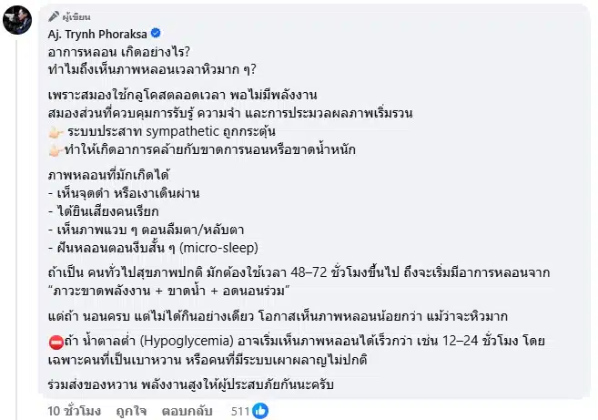 นอกจากนี้ ดร.ตฤณห์ ยังได้ระบุด้วยว่า “อาการหลอน เกิดอย่างไร? ทำไมถึงเห็นภาพหลอนเวลาหิวมาก ๆ?
