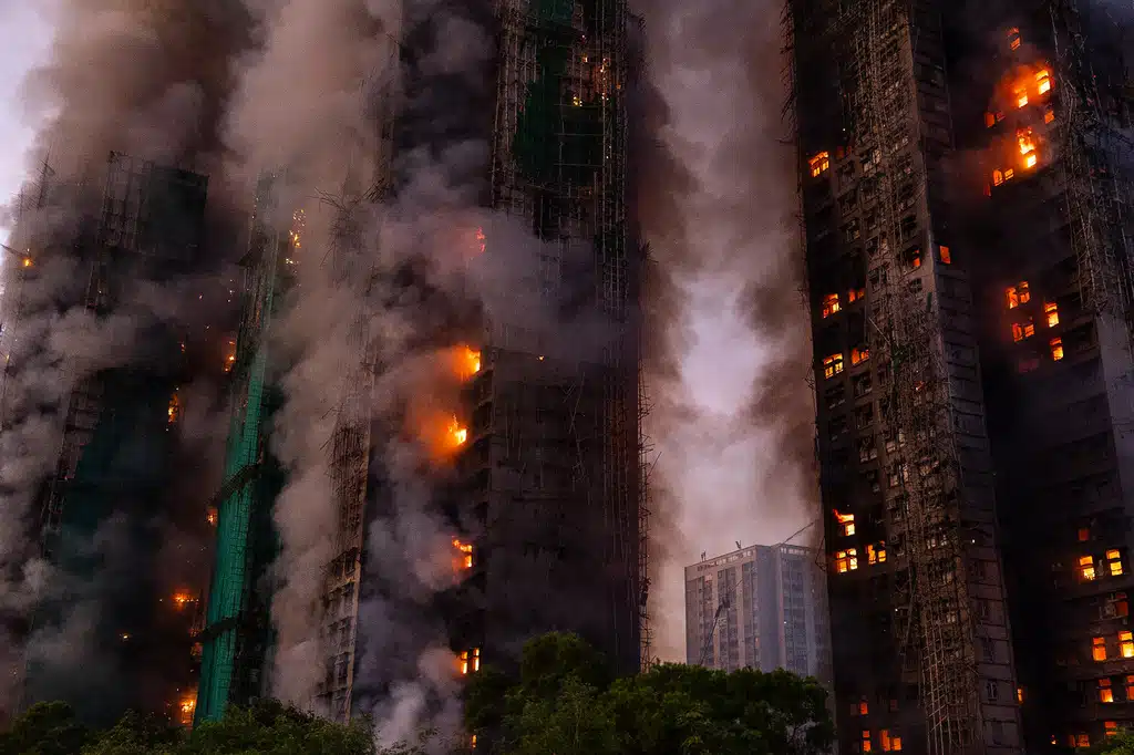 Flames engulf a building after a fire broke out at Wang Fuk Court, a residential estate in the Tai Po district of Hong Kong’s New Territories, Wednesday, Nov. 26 2025. (AP Photo/Chan Long Hei)