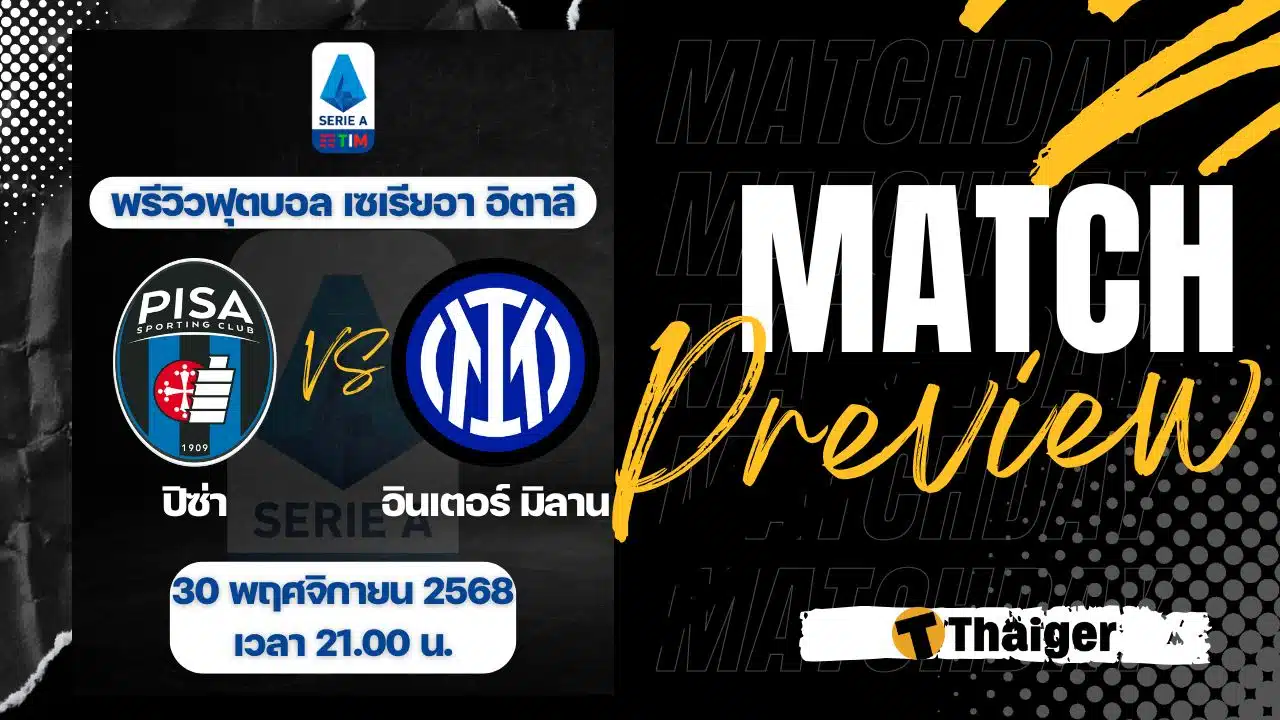 30 พฤศจิกายน 2568 เวลา 21.00 น. ถ่ายทอดสด ดูบอลสด ฟุตบอล กัลโช่ เซเรียอา อิตาลี ฤดูกาล 2025/26 ที่สนาม อารีน่า การิบัลดี-สตาดิโอ โรเมโอ อันโกเนตานี่ ปิซ่า พบ อินเตอร์ มิลาน The Thaiger พาไปวิเคราะห์เกม พร้อมการทำนายผล และคาดการณ์ 11 ตัวจริงได้ที่นี่
