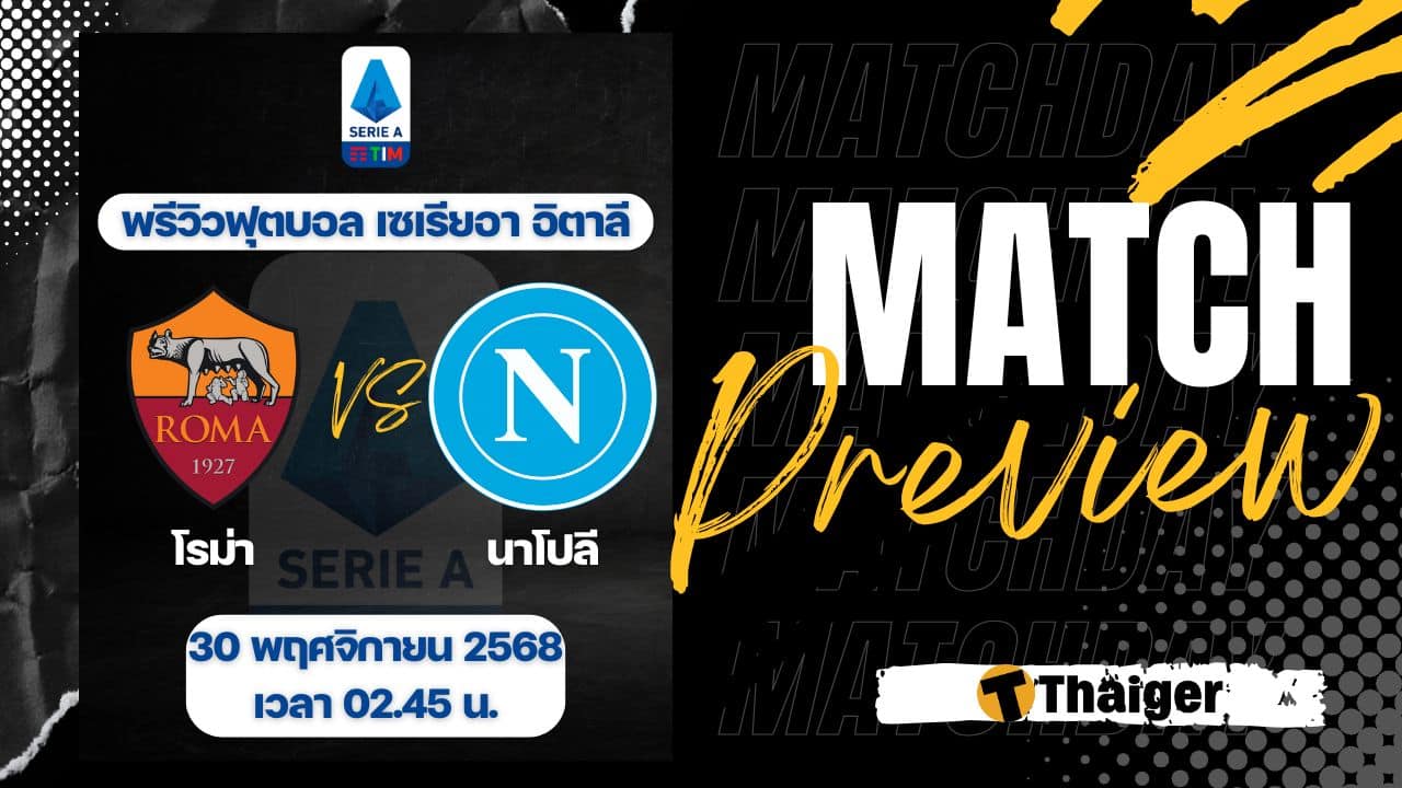30 พฤศจิกายน 2568 เวลา 02.45 น. ถ่ายทอดสด ดูบอลสด ฟุตบอล กัลโช่ เซเรียอา อิตาลี ฤดูกาล 2025/26 ที่สนาม สตาดิโอ โอลิมปิโก โรม่า พบ นาโปลี The Thaiger พาไปวิเคราะห์เกม พร้อมการทำนายผล และคาดการณ์ 11 ตัวจริงได้ที่นี่