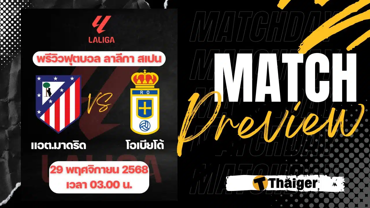 29 พฤศจิกายน 2568 เวลา 03.00 น. ถ่ายทอดสด ดูบอลสด ฟุตบอล ลาลีกา สเปน ฤดูกาล 2025/26 ที่สนาม ริยาห์ด แอร์ เมโทรโปลิตาโน่ แอต.มาดริด พบ โอเบียโด้ The Thaiger พาไปวิเคราะห์เกม พร้อมการทำนายผล และคาดการณ์ 11 ตัวจริงได้ที่นี่