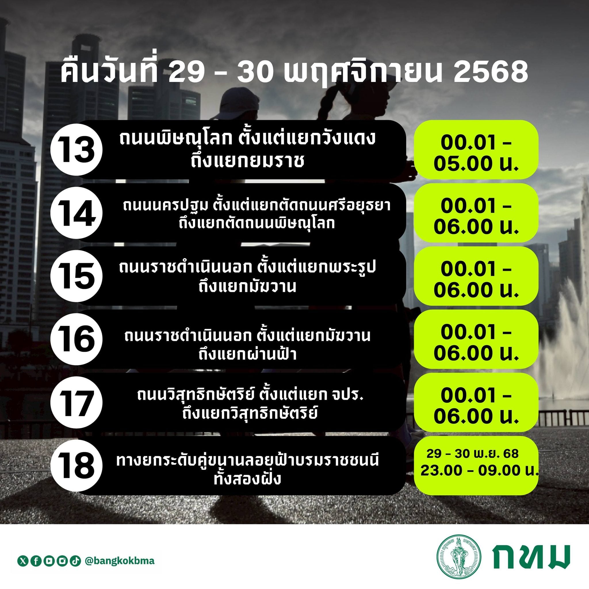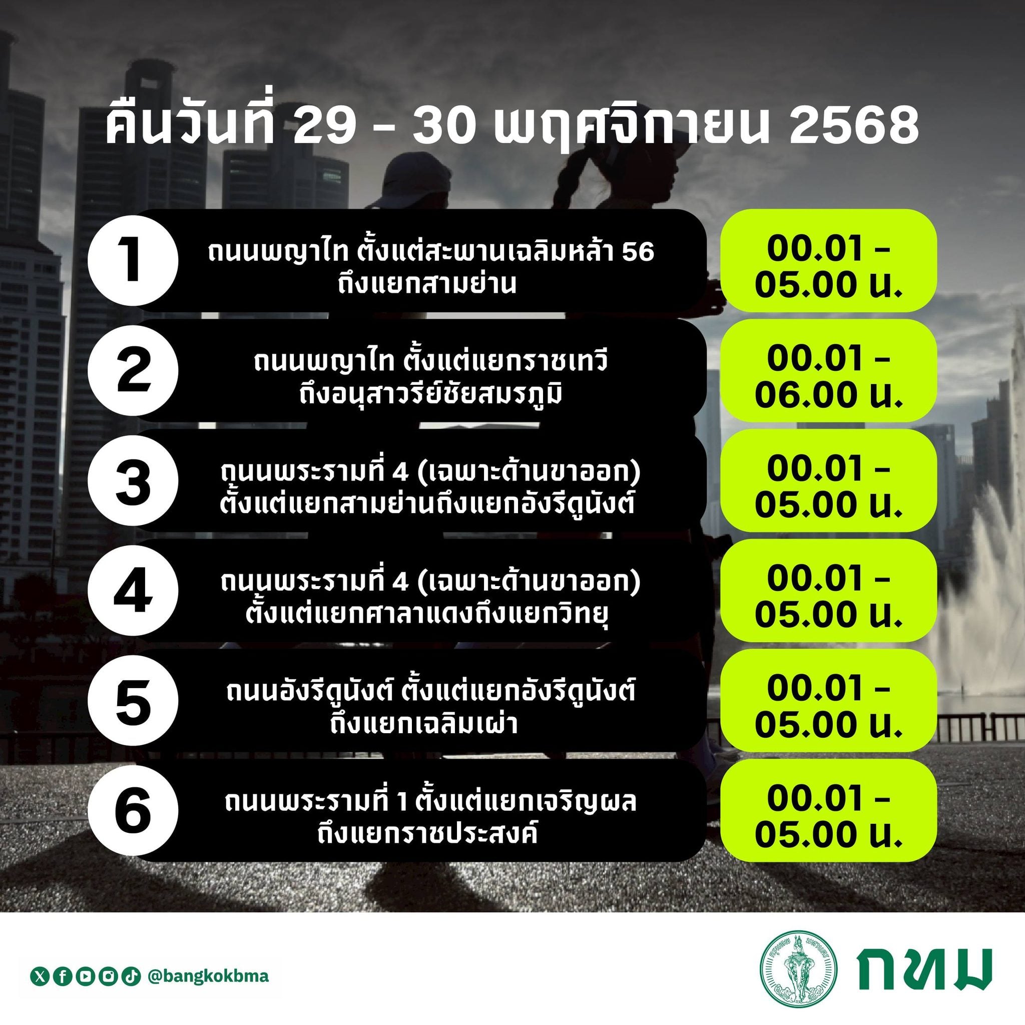 - ถนนพระรามที่ 1 ตั้งแต่แยกเจริญผลถึงแยกราชประสงค์ ตั้งแต่เวลา 00.01-05.00 น. ของวันที่ 30 พ.ย. 68