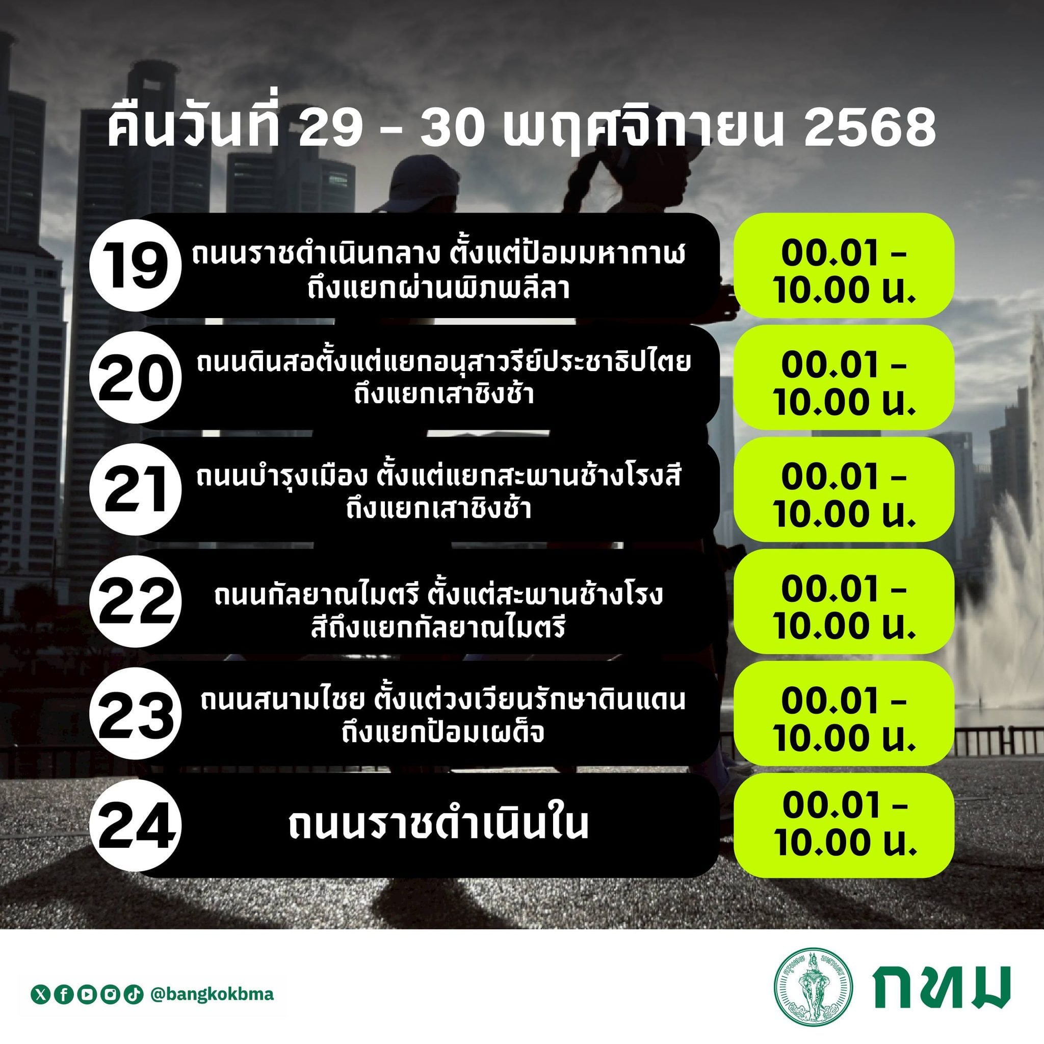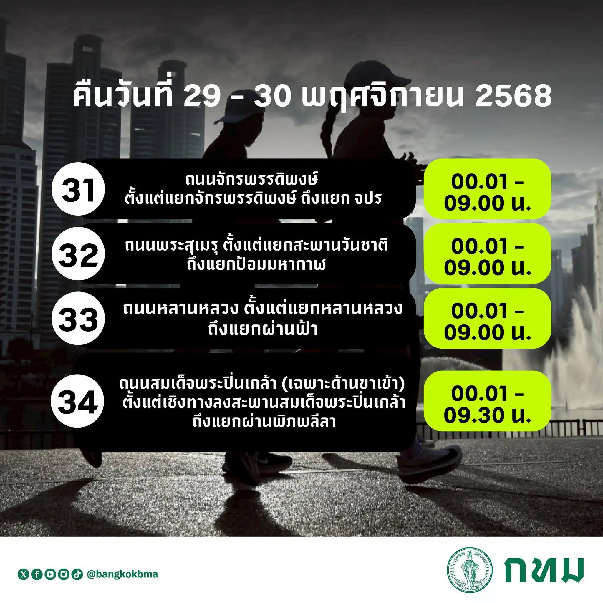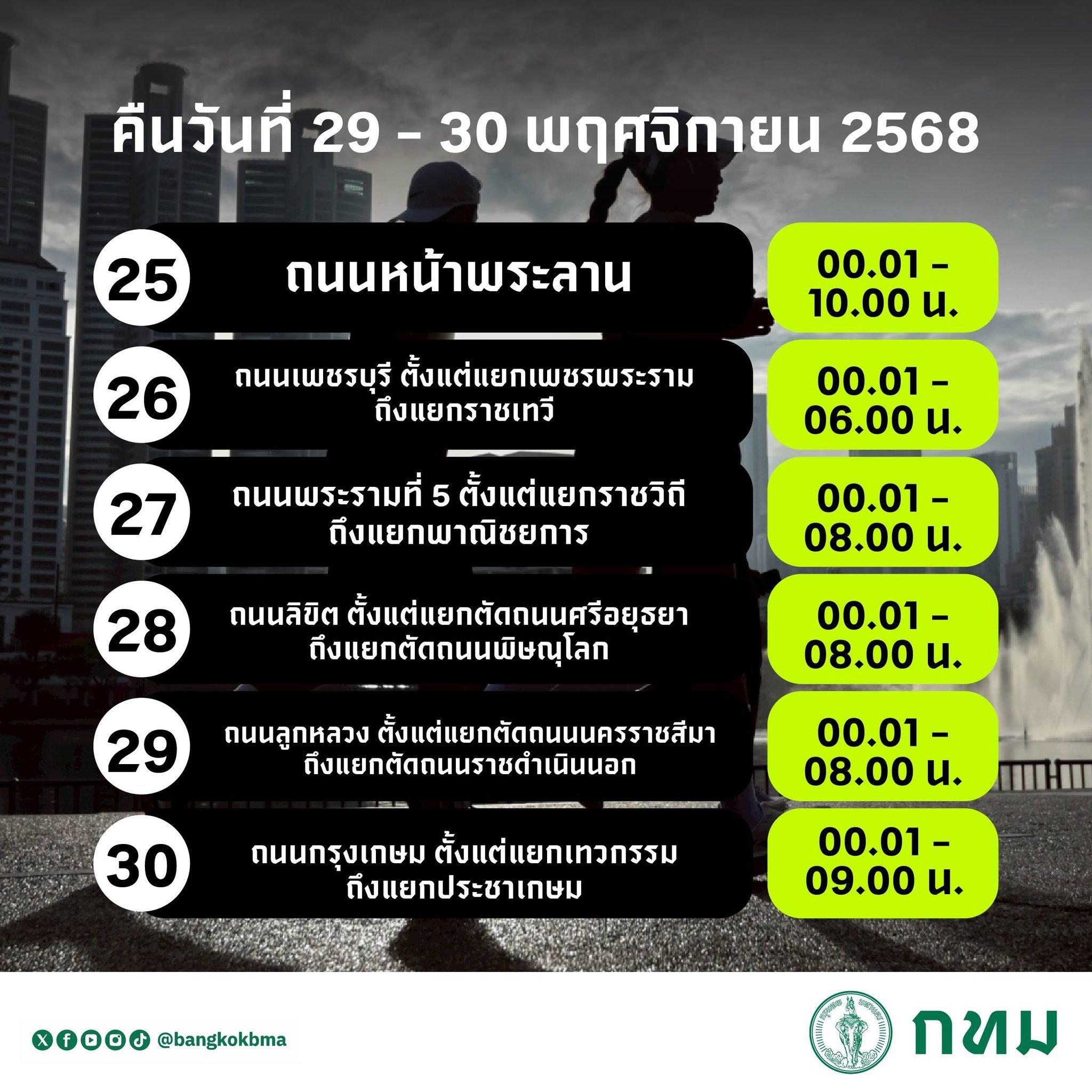 - ถนนสนามไชย ตั้งแต่วงเวียนรักษาดินแดนถึงแยกป้อมเผด็จ ตั้งแต่เวลา 00.01-10.00 น. ของวันที่ 30 พ.ย. 68