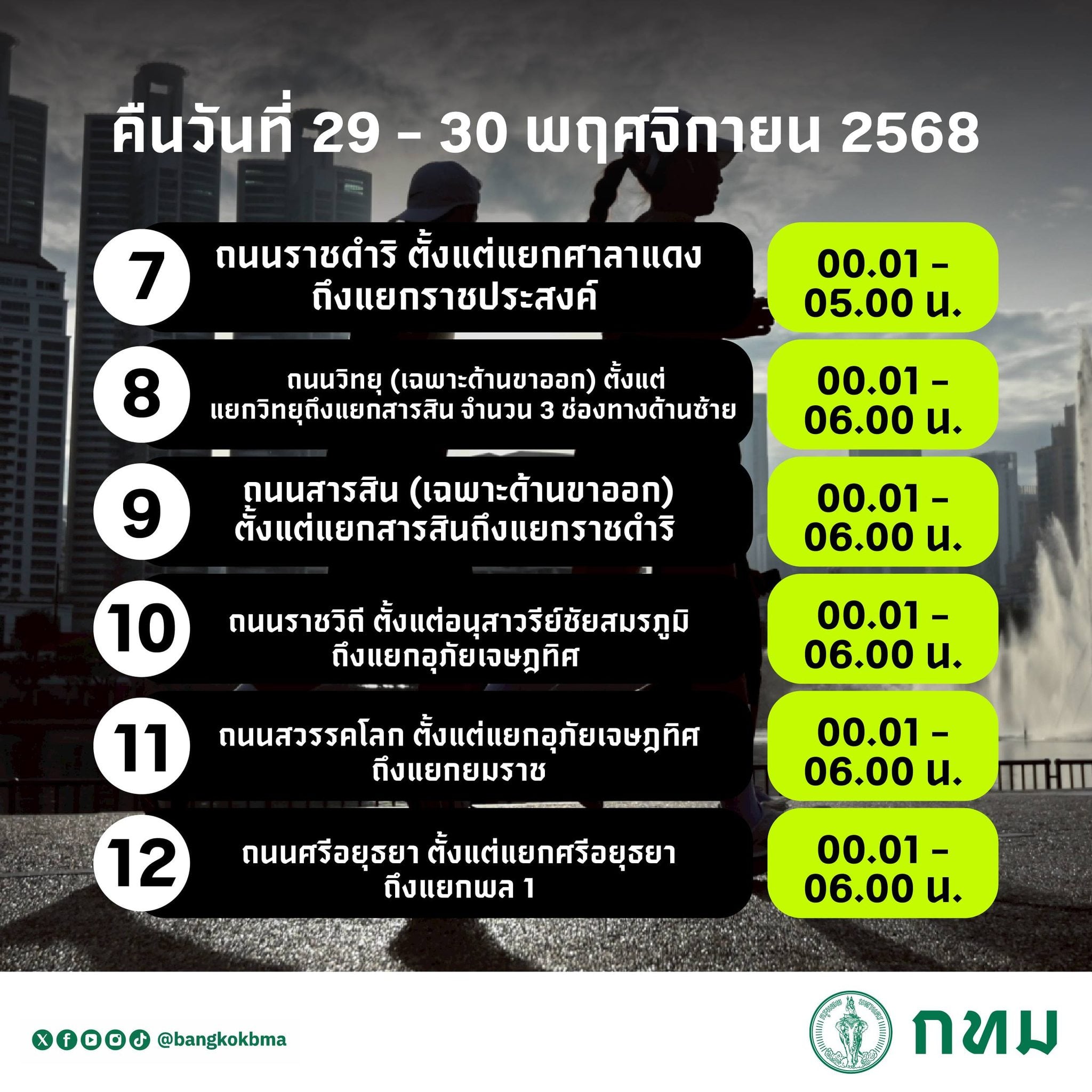- ถนนราชดำริ ตั้งแต่แยกศาลาแดงถึงแยกราชประสงค์ ตั้งแต่เวลา 00.01-05.00 น. ของวันที่ 30 พ.ย. 68