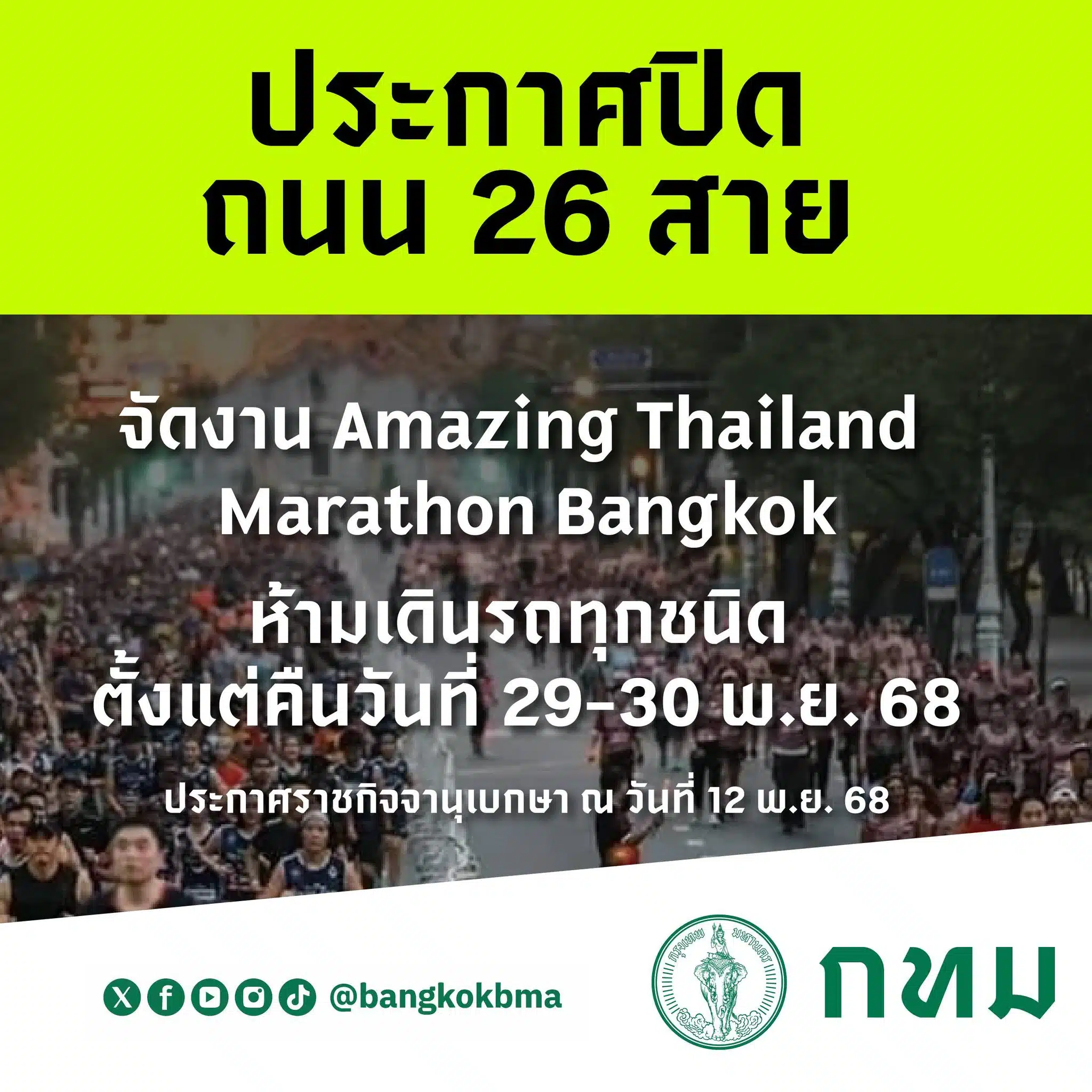 เว็บไซต์ราชกิจจานุเบกษา ประกาศ ปิดถนน วันที่ 29-30 พ.ย. นี้ จัดงาน Amazing Thai Marathon Bangkok ⛔ ห้ามรถทุกชนิดเดินในถนน ดังต่อไปนี้