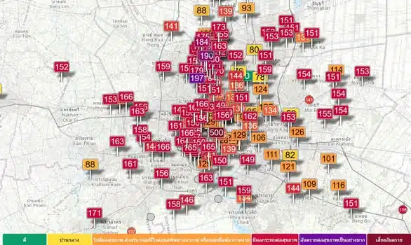 วันที่ 1 ธันวาคม 2568 สำนักงานพัฒนาเทคโนโลยีอวกาศและภูมิสารสนเทศ (องค์การมหาชน) หรือ จิสด้า (GISTDA) อัปเดตค่าฝุ่น PM2.5 จากแอปพลิเคชัน “เช็คฝุ่น” เมื่อเวลา 06.00 น. ทั่วประเทศมีคุณภาพอากาศอยู่ในระดับ “เกินมาตรฐานระดับสีแดง มีผลกระทบต่อสุขภาพและระบบทางเดินหายใจแล้ว 5 จังหวัด และระดับสีส้ม 41 จังหวัด ที่เริ่มจะมีผลต่อสุขภาพและระบบทางเดินหายใจ