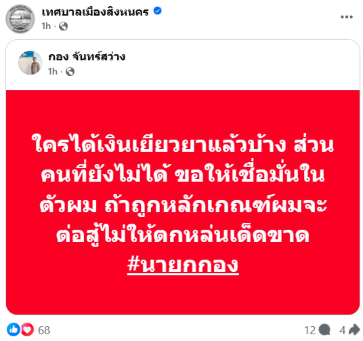 ขณะที่ต่อมา เมื่อเวลา 13.00 น. ที่ผ่านมา นายกเทศบาลสิงหนครโพสต์อัปเดตว่า “ใครได้เงินเยียวยาแล้วบ้าง ส่วนคนที่ยังไม่ได้ ขอให้เชื่อมั่นในตัวผม ถ้าถูกหลักเกณฑ์ผมจะต่อสู้ไม่ให้ตกหล่นเด็ดขาด”.