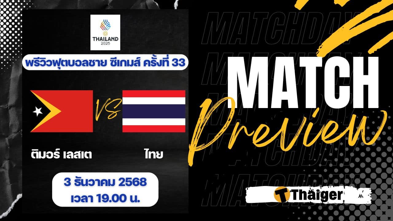 3 ธันวาคม 2568 เวลา 19.00 น. ถ่ายทอดสด ดูบอลสด ฟุตบอล ซีเกมส์ ครั้งที่ 33 ที่สนามราชมังคลากีฬาสถาน คู่ระหว่าง ติมอร์ เลสเต พบ ทีมชาติไทย The Thaiger พาไปวิเคราะห์เกม พร้อมการทำนายผล และคาดการณ์ 11 ตัวจริงได้ที่นี่