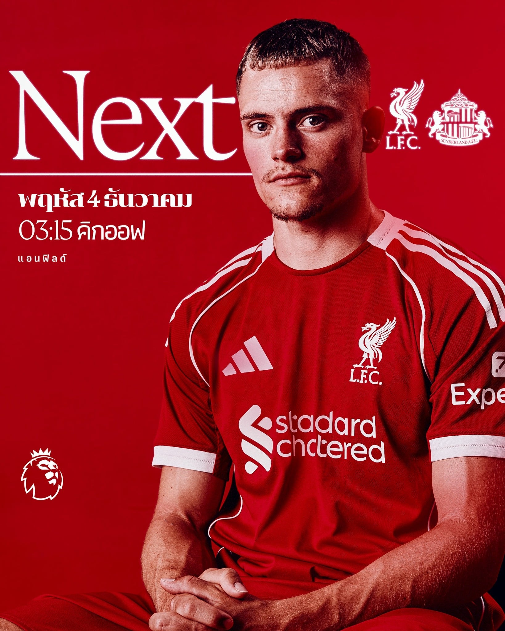 3 ธันวาคม 2568 เวลา 03.15 น. ถ่ายทอดสด ดูบอลสด ฟุตบอล พรีเมียร์ลีก ฤดูกาล 2025/26 ที่สนาม แอนฟิลด์ ลิเวอร์พูล พบ ซันเดอร์แลนด์ The Thaiger พาไปวิเคราะห์เกม พร้อมการทำนายผล และคาดการณ์ 11 ตัวจริงได้ที่นี่