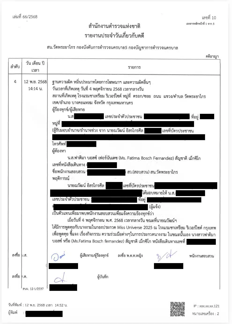 ด้วยเหตุนี้ นายณวัฒน์จึงได้ดำเนินการแจ้งความดำเนินคดีในประเทศไทยกับนางสาวฟาติมา บอช เฟอร์นันเดซ เป็นที่เรียบร้อยแล้วตั้งแต่วันที่ 12 พฤศจิกายน 2568 และประกาศว่าจะดำเนินคดีอย่างถึงที่สุดหากยังพบการกระทำผิดซ้ำอีก