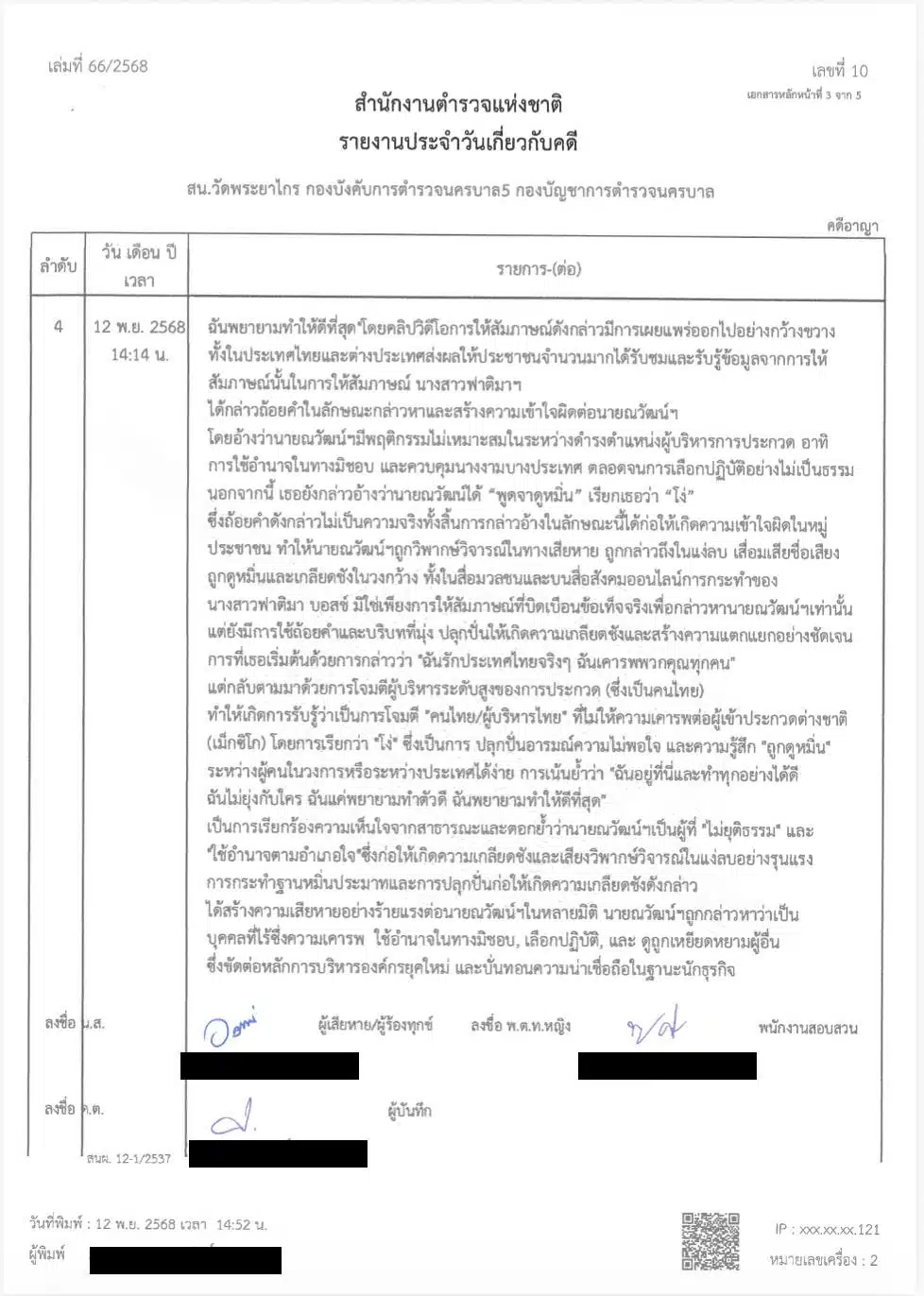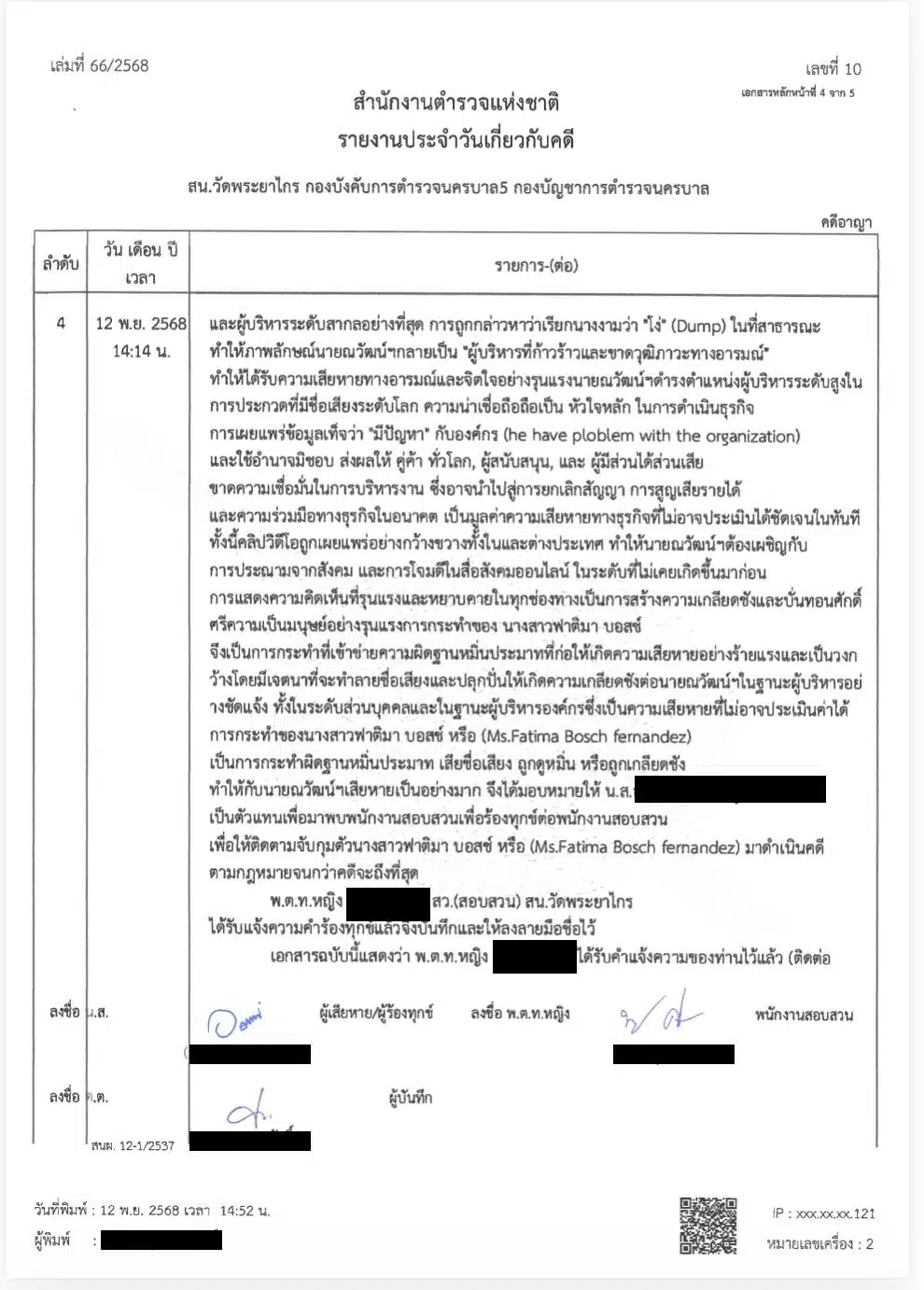 ด้วยเหตุนี้ นายณวัฒน์จึงได้ดำเนินการแจ้งความดำเนินคดีในประเทศไทยกับนางสาวฟาติมา บอช เฟอร์นันเดซ เป็นที่เรียบร้อยแล้วตั้งแต่วันที่ 12 พฤศจิกายน 2568 และประกาศว่าจะดำเนินคดีอย่างถึงที่สุดหากยังพบการกระทำผิดซ้ำอีก