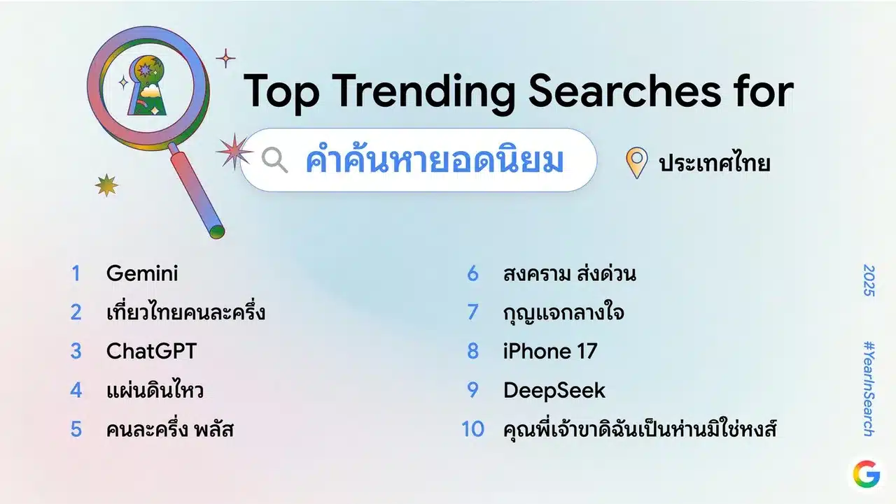 Google เปิดคำค้นหาประจำปี 2568 เอไอผงาด Gemini เป็นอันดับหนึ่ง ส่วนข่าวที่คนให้ความสนใจมากที่สุดประจำปีเป็นข่าวแผ่นดินไหว
