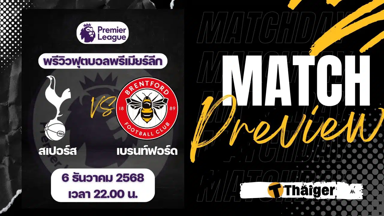 6 ธันวาคม 2568 เวลา 22.00 น. ถ่ายทอดสด ดูบอลสด ฟุตบอล พรีเมียร์ลีก ฤดูกาล 2025/26 ที่สนาม ท็อตแน่ม ฮอตสเปอร์ สเตเดี้ยม สเปอร์ส พบ เบรนท์ฟอร์ด The Thaiger พาไปวิเคราะห์เกม พร้อมการทำนายผล และคาดการณ์ 11 ตัวจริงได้ที่นี่