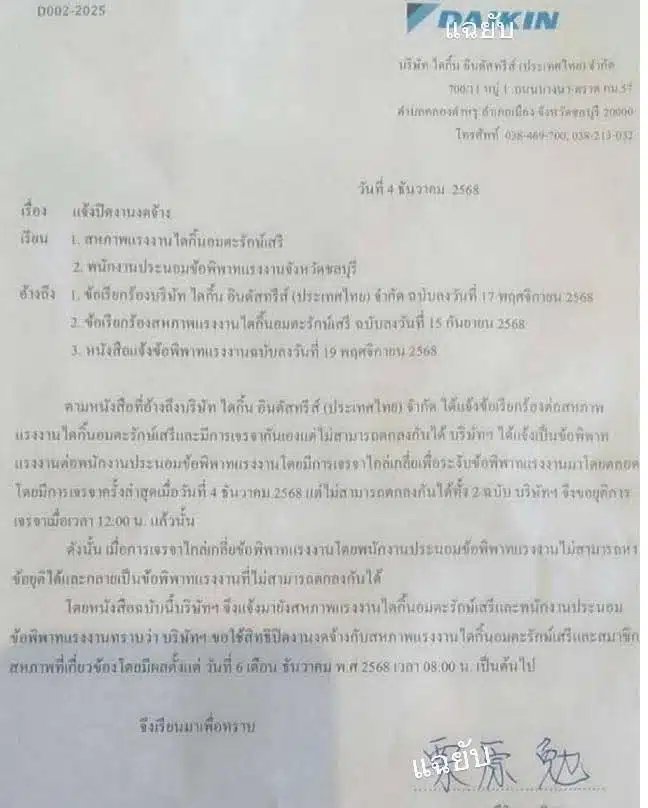 ผู้สื่อข่าวรายงาน โลกออนไลน์ มีการแชร์เอกสาร ลงวันที่ 4 ธันวาคม 2568 เรื่อง แจ้งปิดงานงดจ้าง ออกโดยบริษัท ไดกิ้น อินดัสทรีย์ ประเทศไทย