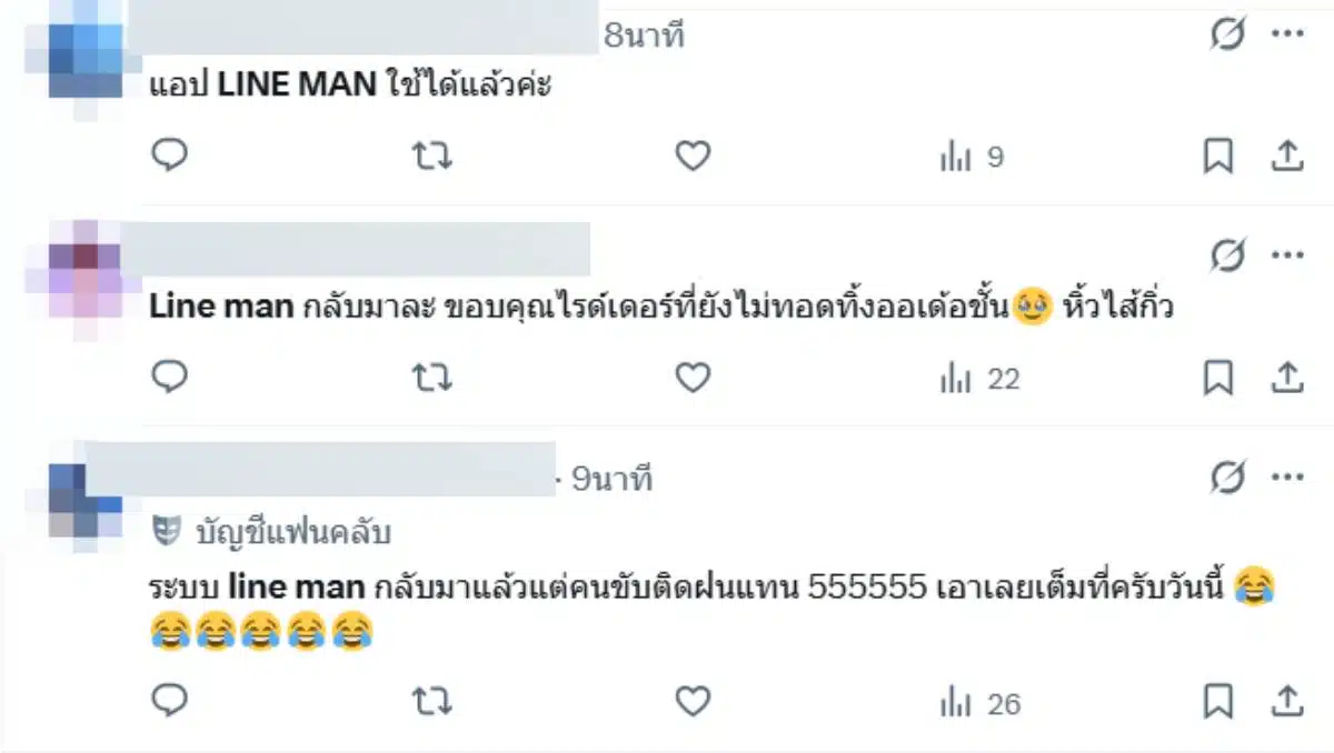 ตรวจสอบล่าสุดบนบัญชีเอ็กซ์ เริ่มมีการแจ้งว่าบางพื้นที่ระบบสามารถกลับมาใช้งานได้บ้างแล้ว “แอป LINE MAN ใช้ได้แล้วค่ะ”