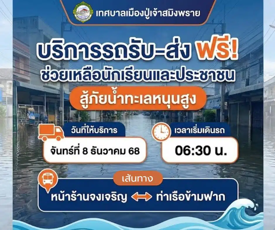ขณะที่ เทศบาลเมืองปู่เจ้าสมิงพราย สมุทรปราการ ประชาสัมพันธ์ด่วน! เทศบาลเมืองปู่เจ้าสมิงพรายได้จัดรถรับ-ส่ง บริการประชาชนและนักเรียน สู้ภัยน้ำทะเลหนุน เนื่องจากสถานการณ์น้ำทะเลหนุนสูง ส่งผลให้มีน้ำท่วมขังผิวจราจรบริเวณ “หน้าร้านจงเจริญ ยาวไปจนถึง ท่าเรือข้ามฟาก” ทำให้การสัญจรเป็นไปด้วยความยากลำบาก เพื่อบรรเทาความเดือดร้อนและอำนวยความสะดวกให้กับพี่น้องประชาชน รวมถึงลูกหลานนักเรียนที่ต้องเดินทางไปเรียนในช่วงเช้า