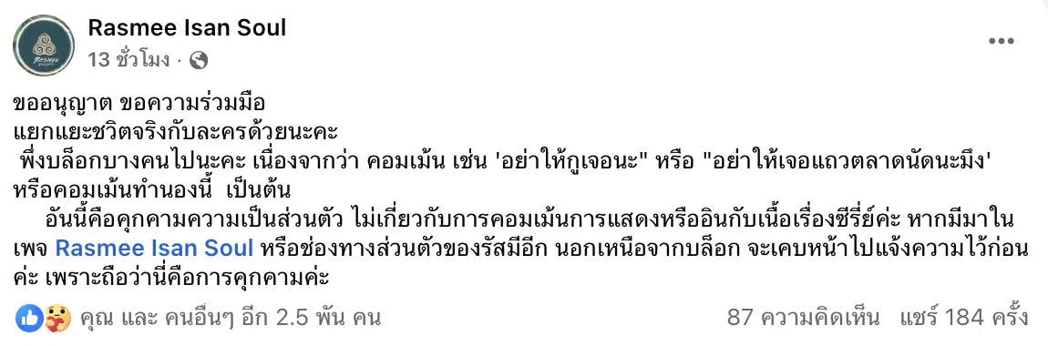 ล่าสุด เพจเฟซบุ๊ก Rasmee Isan Soul ได้ออกมาโพสต์ข้อความขอความร่วมมือจากผู้ชมให้แยกแยะชีวิตจริงกับละคร ระบุว่าเธอได้บล็อกผู้ใช้บางรายที่เข้ามาคอมเมนต์ด้วยถ้อยคำรุนแรงในลักษณะข่มขู่ เช่น “อย่าให้กูเจอนะ” หรือ “อย่าให้เจอแถวตลาดนัดนะมึง”