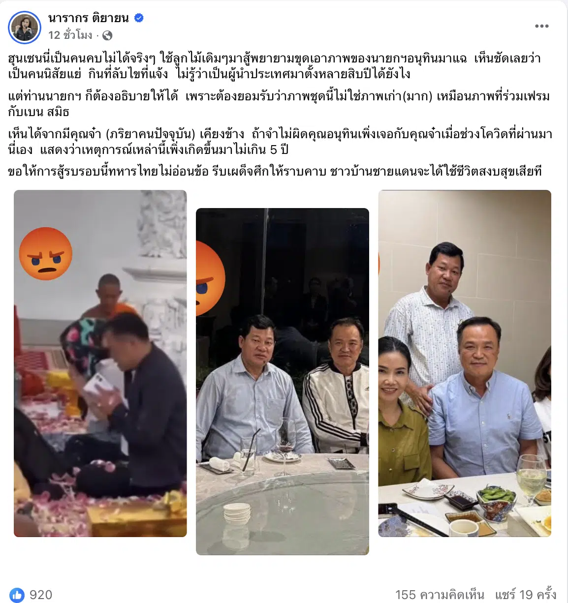 นารากร ติยายน โพสต์เดือดฉะฮุนเซน “คบไม่ได้” ปล่อยภาพดิสเครดิตนายกฯ ไทย แต่กดดัน “อนุทิน” ต้องอธิบายสังคมให้ได้ หลังจับโป๊ะภาพมีภริยาปัจจุบันร่วมเฟรม ยันไม่ใช่ภาพเก่า
