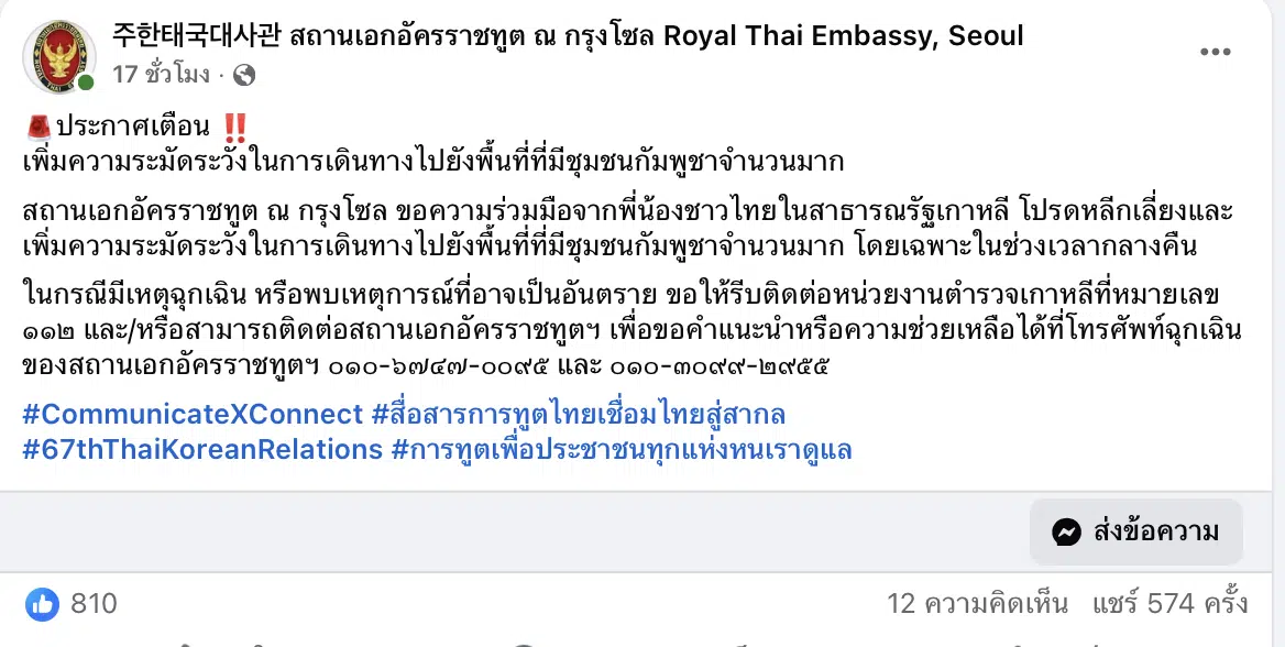ต่อมาวันที่ 8 ธันวาคม 2568 สถานเอกอัครราชทูตไทย ณ กรุงโซล ออกประกาศขอความร่วมมือคนไทยในสาธารณรัฐเกาหลีหลีกเลี่ยงและเพิ่มความระมัดระวังในการเดินทางไปยังพื้นที่ที่มีชุมชนกัมพูชาจำนวนมาก โดยเฉพาะช่วงเวลากลางคืน