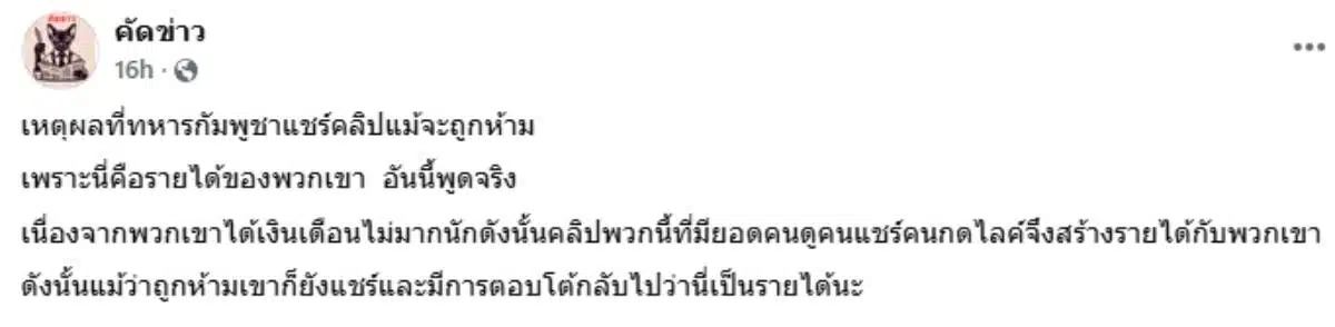 ต่อมาเฟซบุ๊กแฟนเพจ “คัดข่าว“ มองกรณีทหารกัมพูชาชอบถ่ายคลิปสู้รบลงโซเชียล สาเหตุหลักปฏิเสธไม่ได้ว่ามาจากช่องทางนี้สร้างรายได้ให้พวกเขานั่นเอง