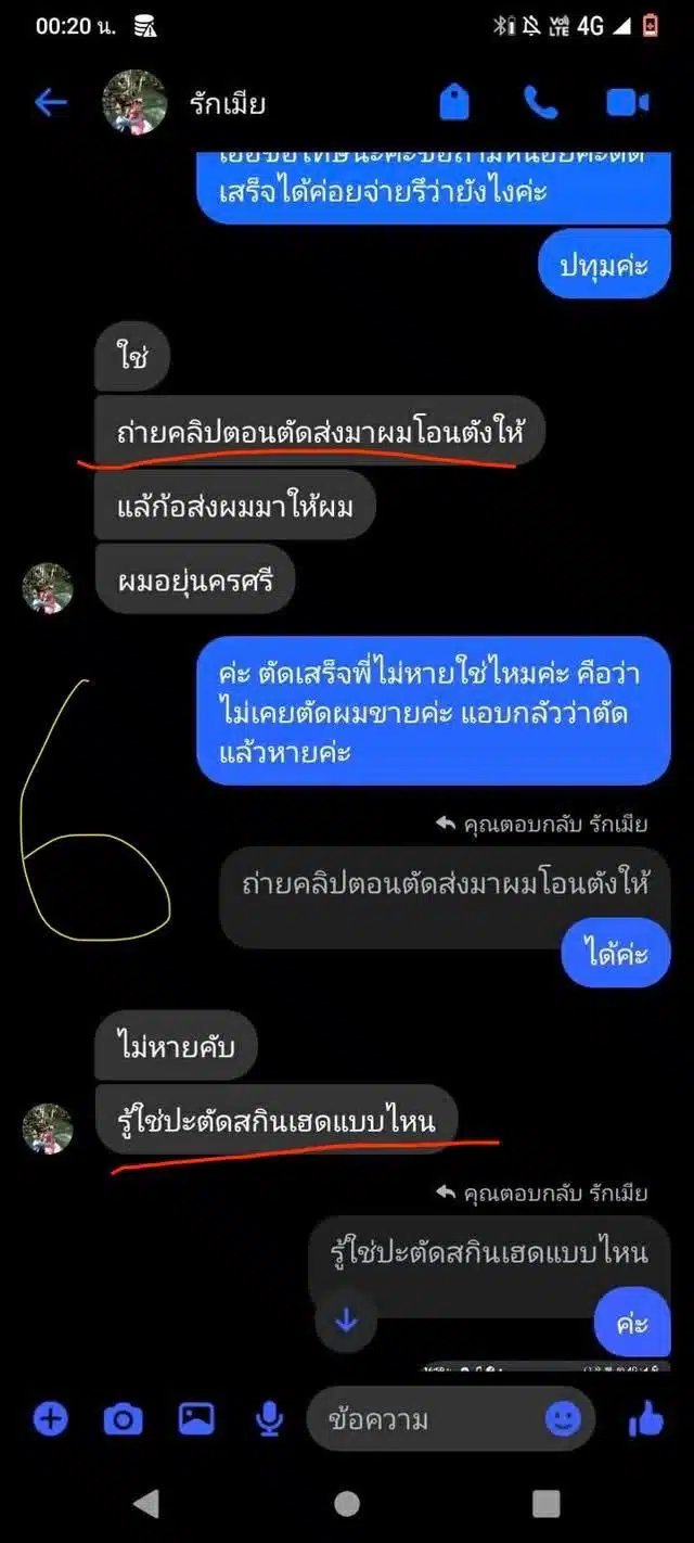 เจ้าของโพสต์ได้แนบ หลักฐานแชทการสนทนาชี้ชัดว่ามิจฉาชีพรายนี้อาจมีเจตนาหลอกให้เหยื่อโกนผมเพื่อความพึงพอใจส่วนตัว หรือมีรสนิยมชอบดูการตัดผมสั้นเกรียน มากกว่าต้องการรับซื้อเส้นผมจริง