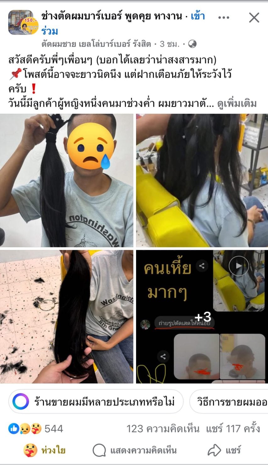 เจ้าของโพสต์เล่าว่า มีลูกค้าผู้หญิงผมยาวเดินเข้ามาในร้าน แจ้งความประสงค์ว่าต้องการตัดผมเพื่อนำไปขาย ช่างตัดผมจึงแนะนำให้ไปร้านเสริมสวยสำหรับผู้หญิง แต่ลูกค้ากลับยืนกรานที่จะตัดกับช่างผู้ชาย ทำให้ผู้โพสต์เริ่มรู้สึกแปลกใจแต่ก็ไม่ได้ซักไซ้ต่อ