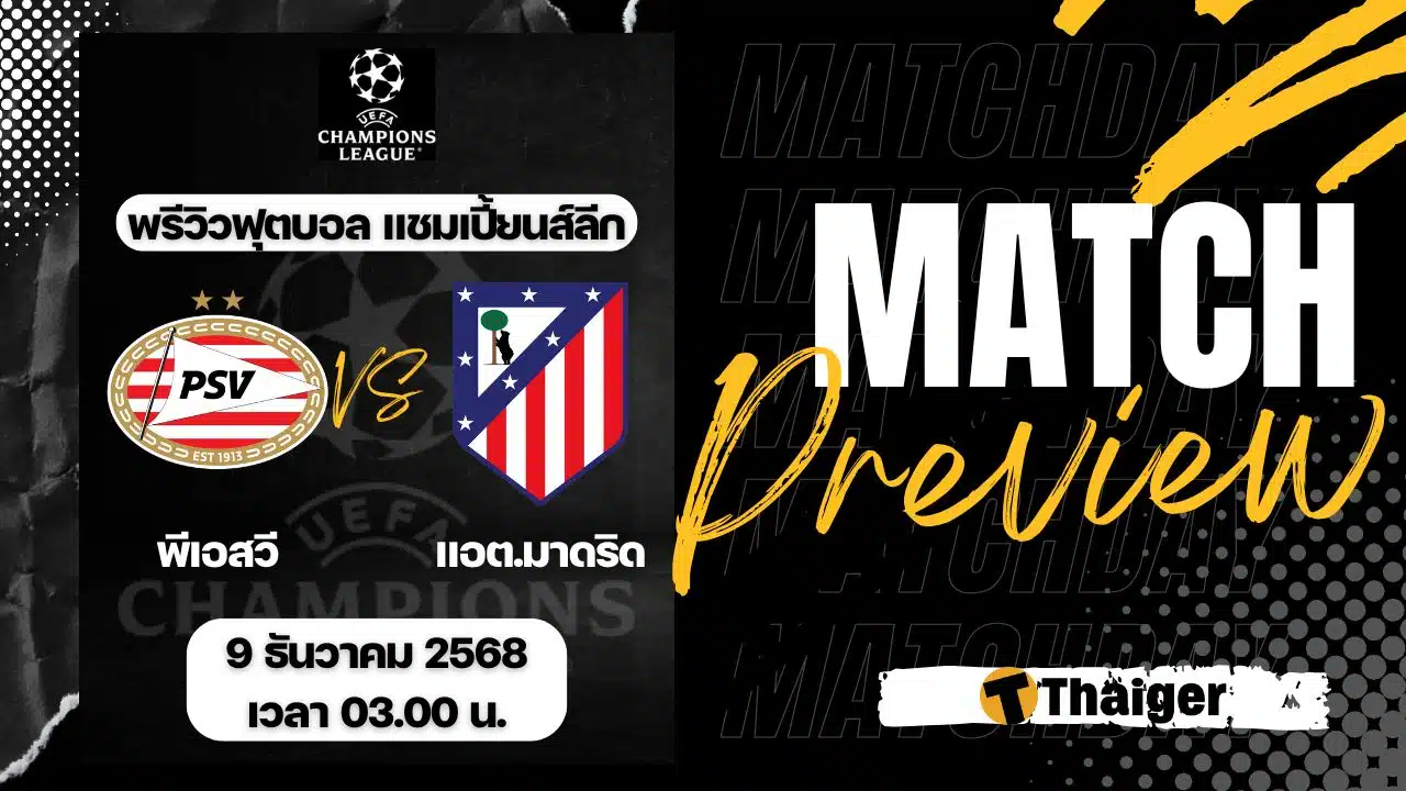 9 ธันวาคม 68 ดูบอลสด ฟุตบอล ยูฟ่า แชมเปี้ยนส์ ลีก รอบลีกเฟส นัดที่ 6 ระหว่าง พีเอสวี พบ แอต.มาดริด ที่สนาม ฟิลิปส์ สเตเดี้ยม เวลา 03:00 น. ตามเวลาประเทศไทย พร้อมถ่ายทอดสด