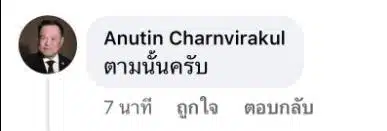 ทั้งนี้ใต้โพสต์นาย อนุทิน ได้เข้ามาตอบสั้นๆด้วยว่า “ตามนั้นครับ”