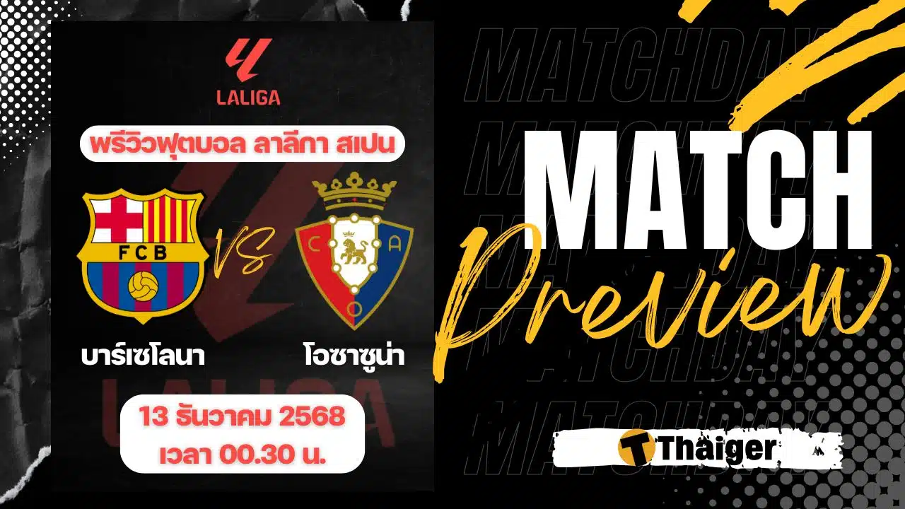 13 ธันวาคม 2568 เวลา 00.30 น. ถ่ายทอดสด ดูบอลสด ฟุตบอล ลาลีกา สเปน ฤดูกาล 2025/26 ที่สนาม สปอติฟาย คัมป์ นู บาร์เซโลนา พบ โอซาซูน่า The Thaiger พาไปวิเคราะห์เกม พร้อมการทำนายผล และคาดการณ์ 11 ตัวจริงได้ที่นี่