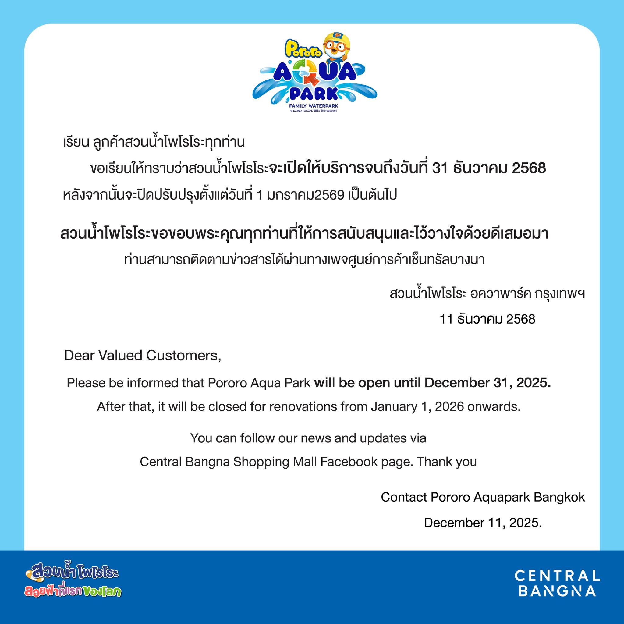 ทำเอาผู้คนที่อาศัยหรือแวะเวียนไปที่ เซนทรัล บางนา ตกใจกันไปตามๆกัน เมื่อล่าสุด (13 ธันวาคม) สวนน้ำโพโรโระ สวนน้ำในตำนานที่ตั้งอยู่บนชั้นดาดฟ้าของห้างดังกล่าว ได้แจ้งว่าจะเปิดให้บริการถึงวันที่ 31 ธันวาคม 2568 เป็นวันสุดท้าย หลังจากนั้นจะ “ปิดปรับปรุง” ตั้งแต่วันที่ 1 มกราคม 2569 เป้นต้นไป