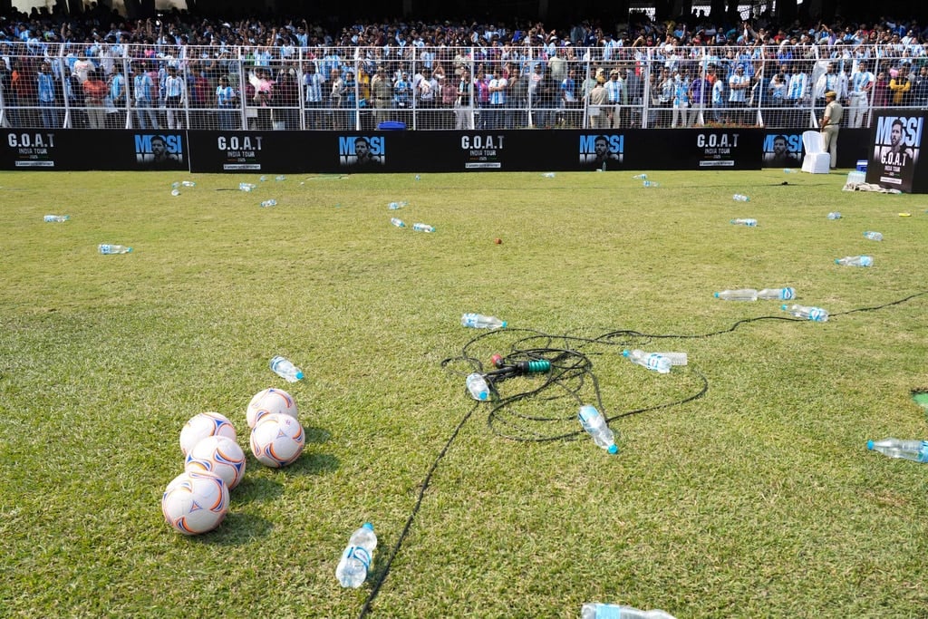 แฟนบอลในโกลกาตาปีนรั้วโยนสิ่งของลงสนามเพราะความโกลาหลในการจัดการ ขณะที่ผู้จัดงานหลักถูกตำรวจควบคุมตัว ผู้ว่ารัฐสั่งสอบสวนและขอโทษเมสซีทันที