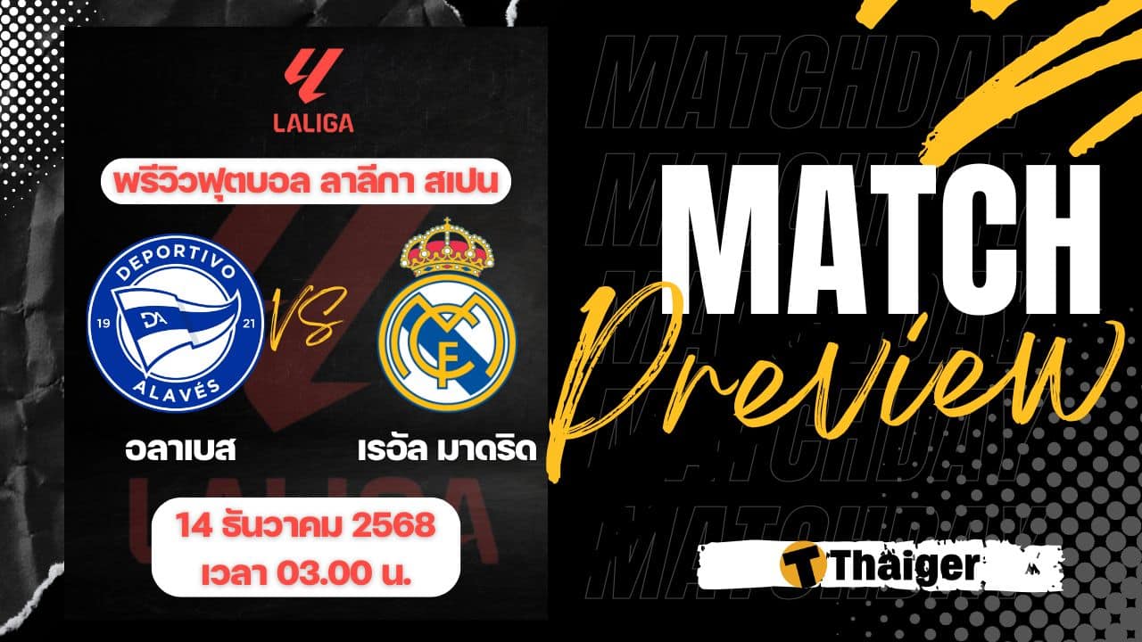 14 ธันวาคม 2568 เวลา 03.00 น. ถ่ายทอดสด ดูบอลสด ฟุตบอล ลาลีกา สเปน ฤดูกาล 2025/26 ที่สนาม เมนดิซอร์โรซ่า สเตเดี้ยม อลาเบส พบ เรอัล มาดริด The Thaiger พาไปวิเคราะห์เกม พร้อมการทำนายผล และคาดการณ์ 11 ตัวจริงได้ที่นี่