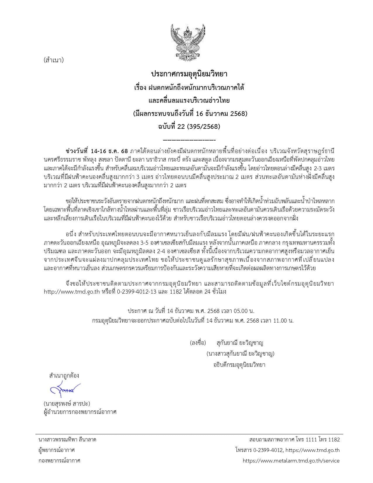 วันนี้ (14 ธ.ค.68) ประกาศกรมอุตุนิยมวิทยา เรื่อง ฝนตกหนักถึงหนักมากบริเวณภาคใต้และคลื่นลมแรงบริเวณอ่าวไทย (มีผลกระทบจนถึงวันที่ 16 ธันวาคม 2568) ฉบับที่ 22 (395/2568)