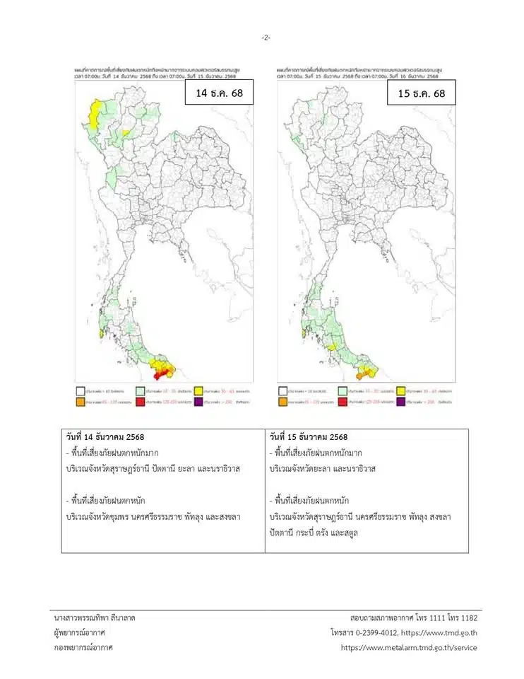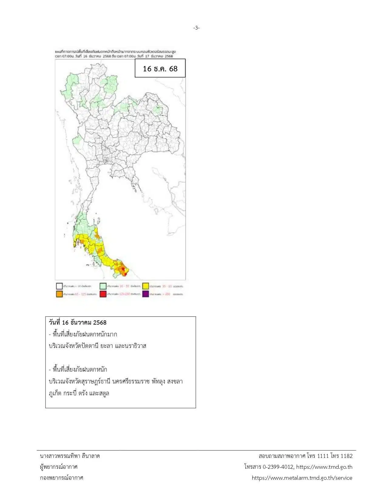 ระบุ ช่วงวันที่ 14-16 ธ.ค. 68 ภาคใต้ตอนล่างยังคงมีฝนตกหนักหลายพื้นที่อย่างต่อเนื่อง บริเวณจังหวัด