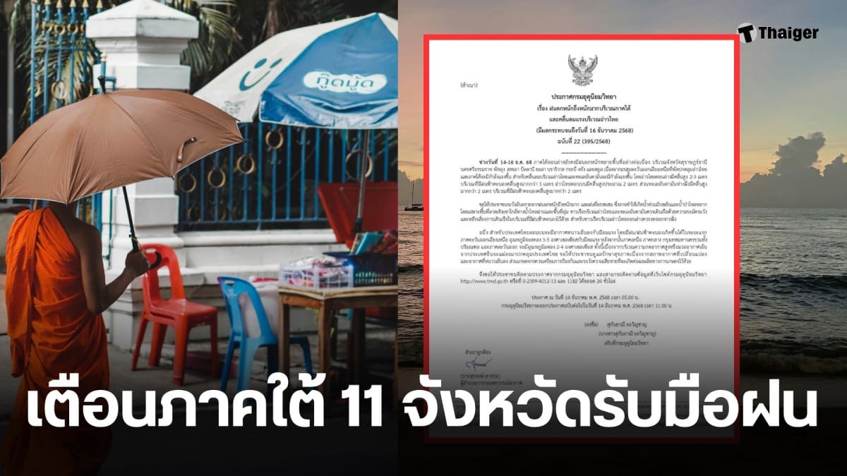 กรมอุตุนิยมวิทยา ออกประกาศฉบับที่ 22 แจ้งเตือน 11 จังหวัดภาคใต้ รับมือฝนตกหนักถึงหนักมาก