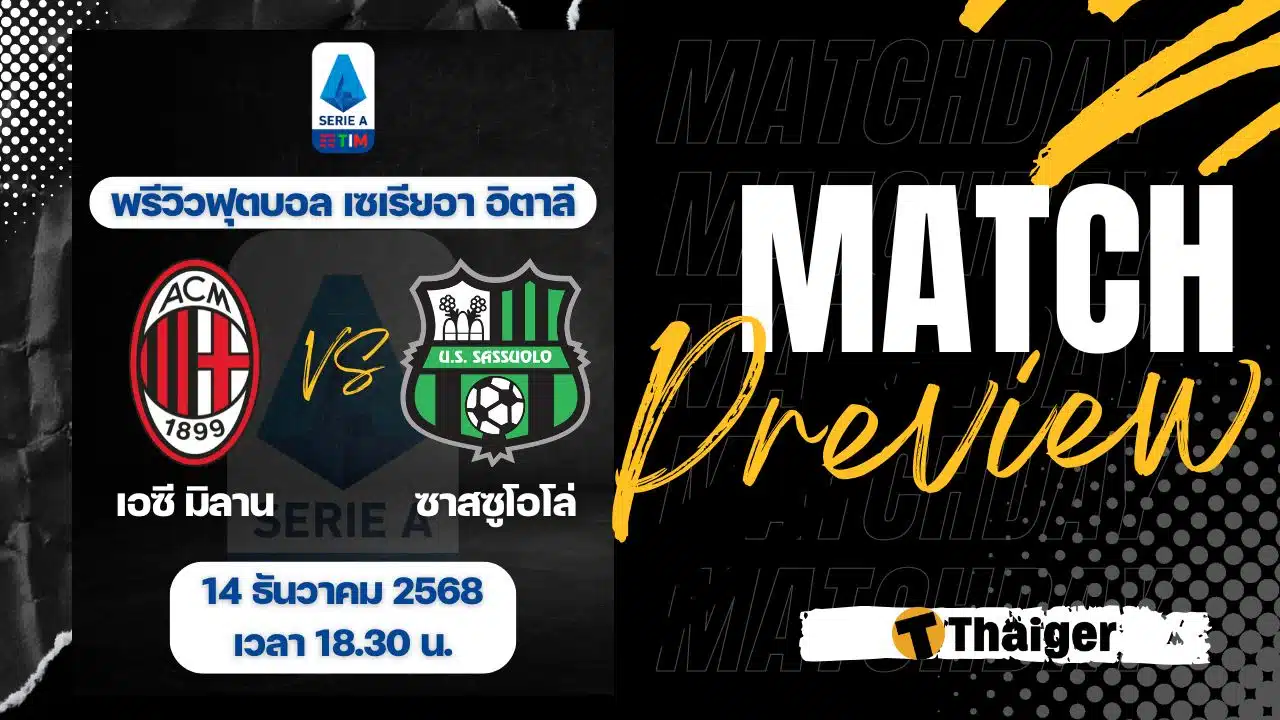 14 ธันวาคม 2568 เวลา 18.30 น. ถ่ายทอดสด ดูบอลสด ฟุตบอล กัลโช่ เซเรียอา อิตาลี ฤดูกาล 2025/26 ที่สนาม ซาน ซิโร่ เอซี มิลาน พบ ซาสซูโอโล่ The Thaiger พาไปวิเคราะห์เกม พร้อมการทำนายผล และคาดการณ์ 11 ตัวจริงได้ที่นี่