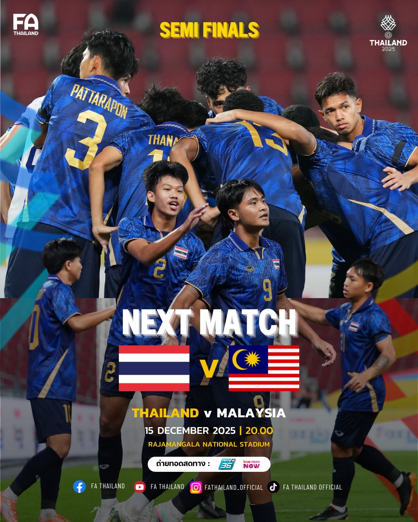 ถ่ายทอดสด ฟุตบอลชาย ซีเกมส์ 2025 รอบรองชนะเลิศ คู่ระหว่าง ไทย พบ มาเลเซีย แข่ง 20.00 น. ช่องถ่ายทอดสด ดูได้ทาง ช่อง PPTV HD 36