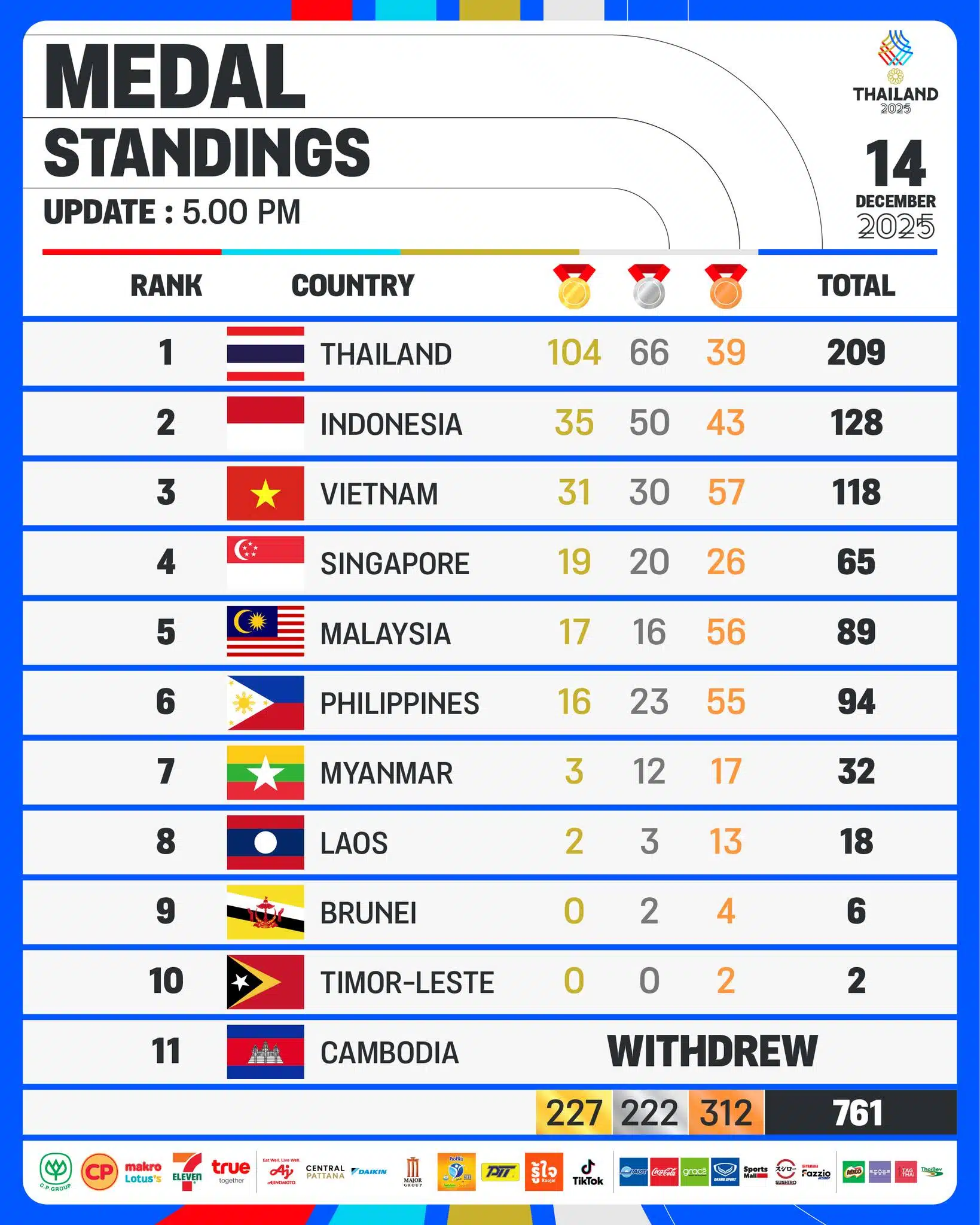ขณะที่อันดับที่ 2 ยังคงเป็น อินโดนีเซีย ที่มี 35 เหรียญทอง แต่ก็ถูกทาง เวียดนาม อันดับที่ 3 ตามมาติดๆ ที่ 31 เหรียญทอง